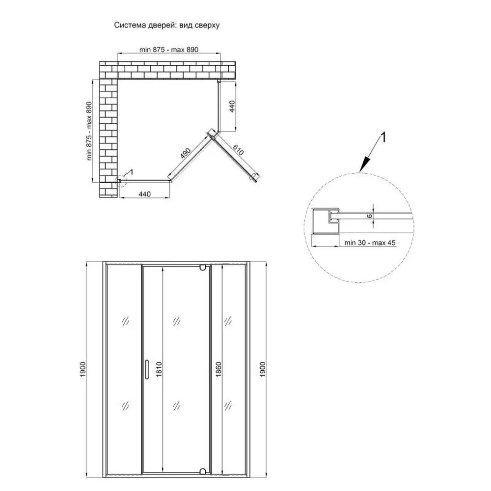 Бічні профілі, набір ущільнювачів, ручка, заглушка, комплект кріпильних деталей, глухе скло, скляні двері у профілі з петлями, розширювальні профілі.