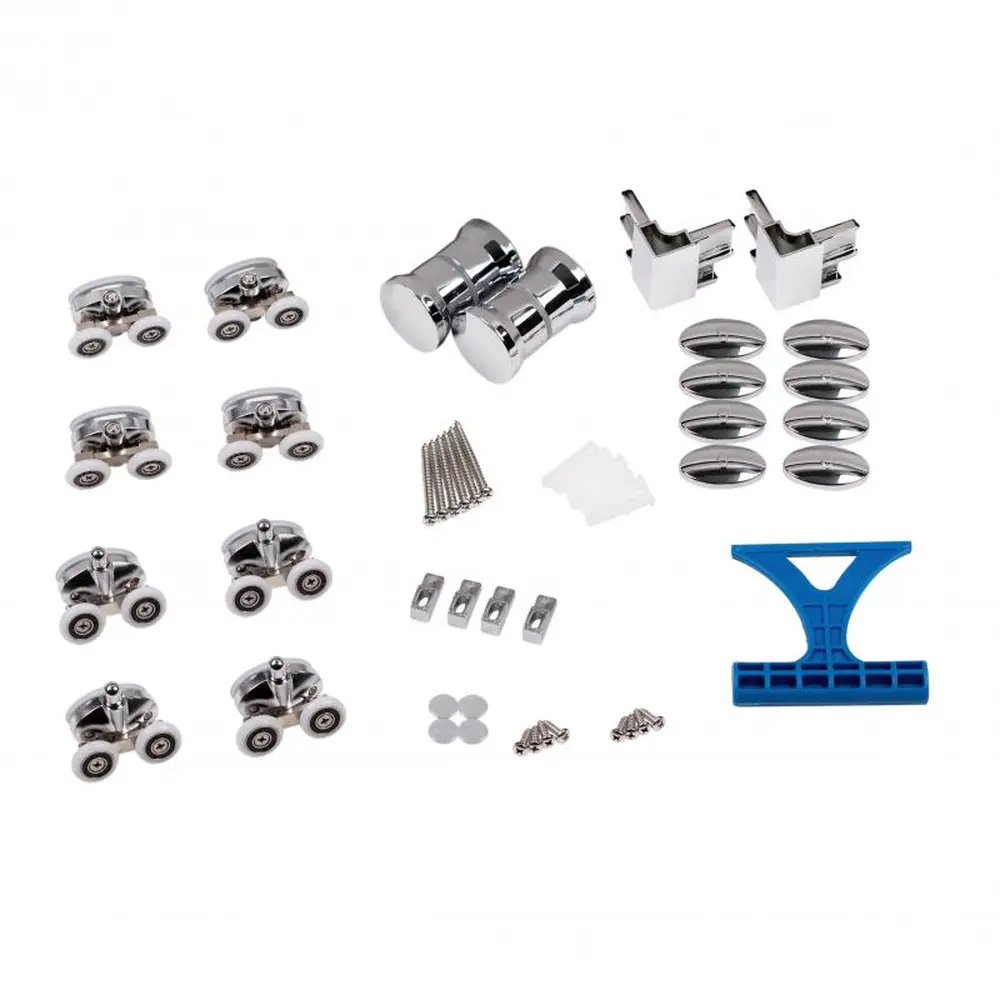 Подвійні ролики, ручки, верхній профіль, нижній профіль, бічні профілі, набір ущільнювачів, розширювальні профілі, 2 скляні двері, 2 глухих скла, комплект кріпильних деталей, заглушки, з‘єднувальні елементи, фіксатори.