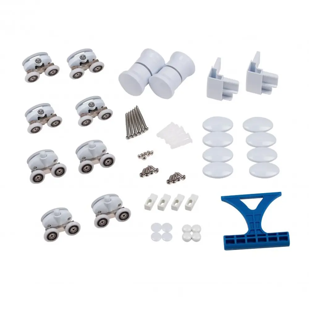 Подвійні ролики, ручки, верхній профіль, нижній профіль, бічні профілі, набір ущільнювачів, розширювальні профілі, 2 скляні двері, 2 глухих скла, комплект кріпильних деталей, заглушки, з‘єднувальні елементи, фіксатори.