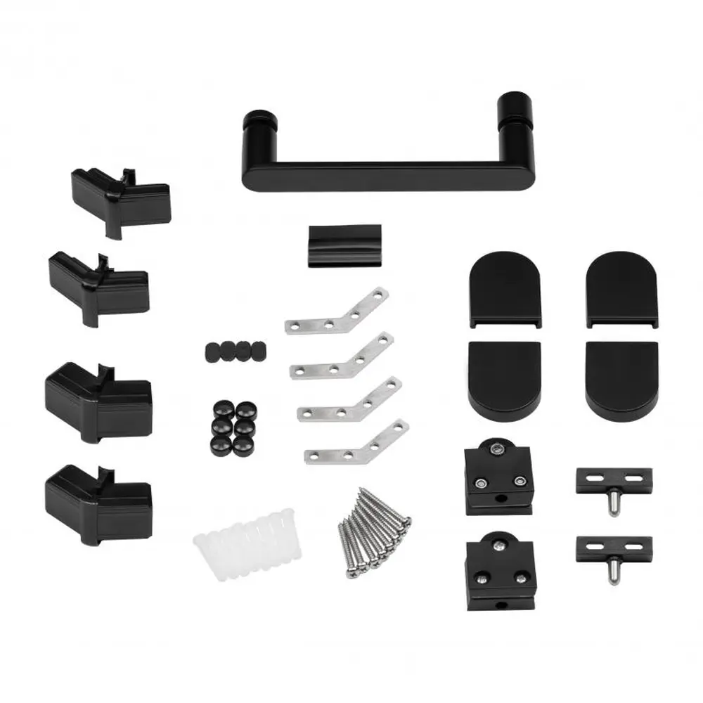 Верхній профіль, нижній профіль, бічні профілі, розширювальні профілі, петлі, тримачі скла, комплект кріпильних деталей, заглушки, ручка, набір ущільнювачів, глухе скло, скляні двері.
