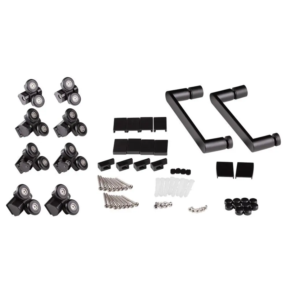Подвійні ролики, ручки, верхній профіль, нижній профіль, бічні профілі, набір ущільнювачів, розширювальні профілі, 2 скляні двері, 2 глухих скла, комплект кріпильних деталей, заглушки, з‘єднувальні елементи, фіксатори.