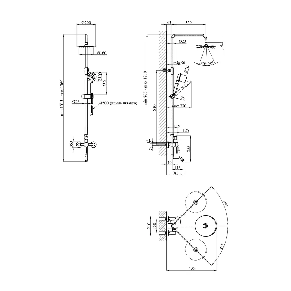 Змішувач, кронштейн для верхнього душу, лійка для верхнього душу, кронштейн для ручного душу, лійка для ручного душу, душовий шланг, душова стійка, кр