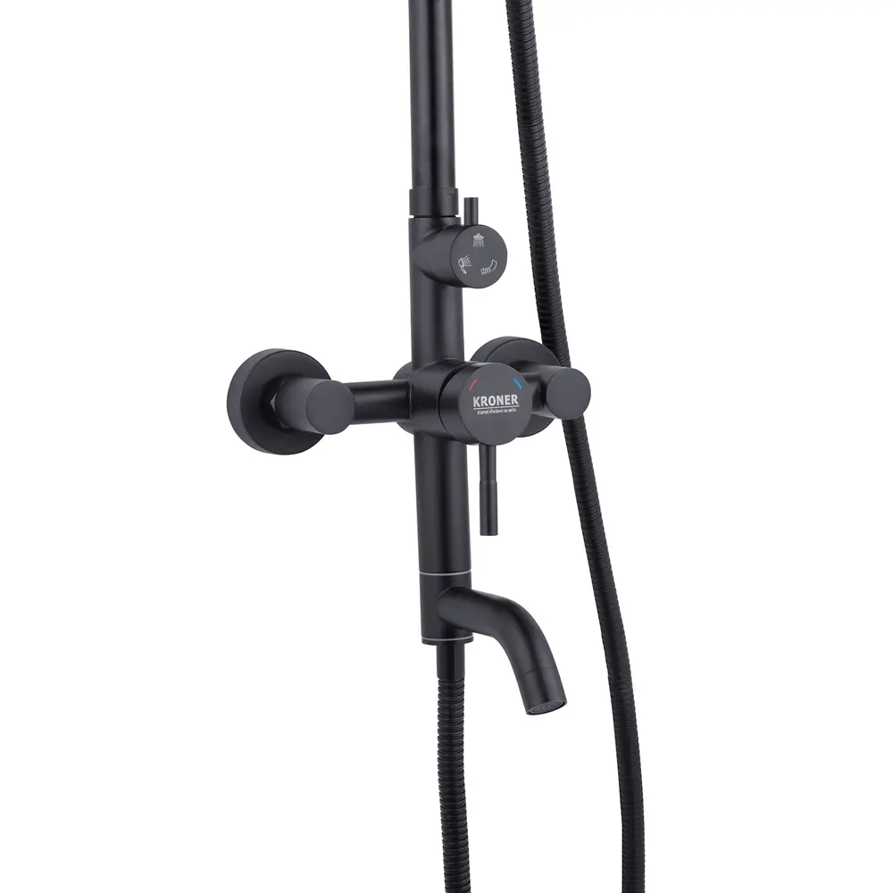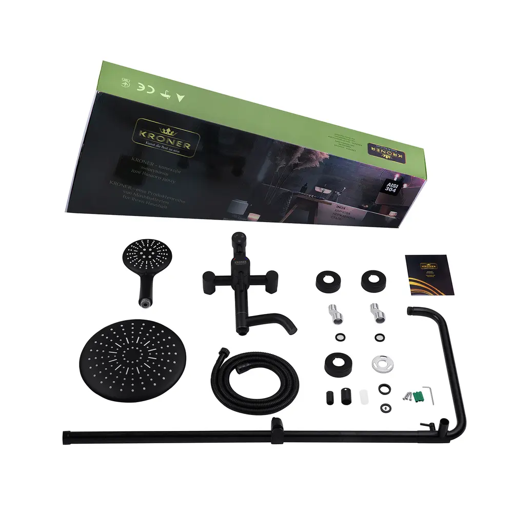 Душові системи від KRONER – це німецька якість, технологія та надійність. Сучасний дизайн стане вдалим доповненням інтер’єру ванної кімнати. Виготовленні з якісних матеріалів, що не піддаються корозії, легкість у збірці не завдасть клопоту при монтажу та використанні. Данна модель виготовлена з нержавіючої сталі AISI 304, має систему проти скручування душового шлангу.