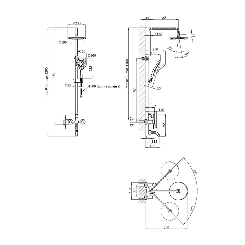 Висота душової стійки, мм