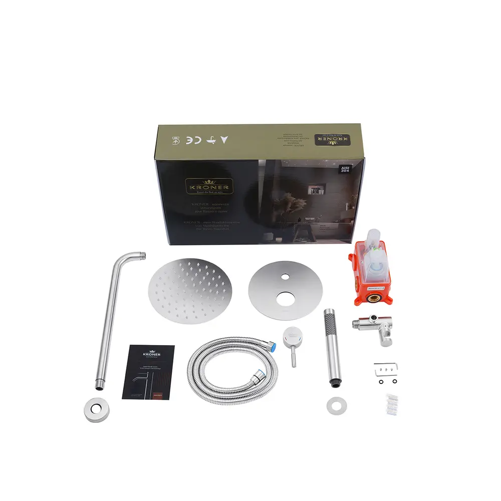 Душовий комплект прихованого монтажу Kroner KRP Edelstahl Klassisch-ESG082 завдяки стильному дизайну чудово впишеться у сучасну ванну кімнату. Душова система виготовлена із харчової нержавіючої сталі. Ручна лійка з 1 режимом доповнена шлангом 1500 мм. Розмір лійки 19х2, 8х2 см. Діаметр тропічного душу 20 см. Управління потоком здійснюється за допомогою настінного важеля. Робочий механізм – довговічний керамічний картридж 35 мм. У постачання включено також внутрішню частину змішувача.