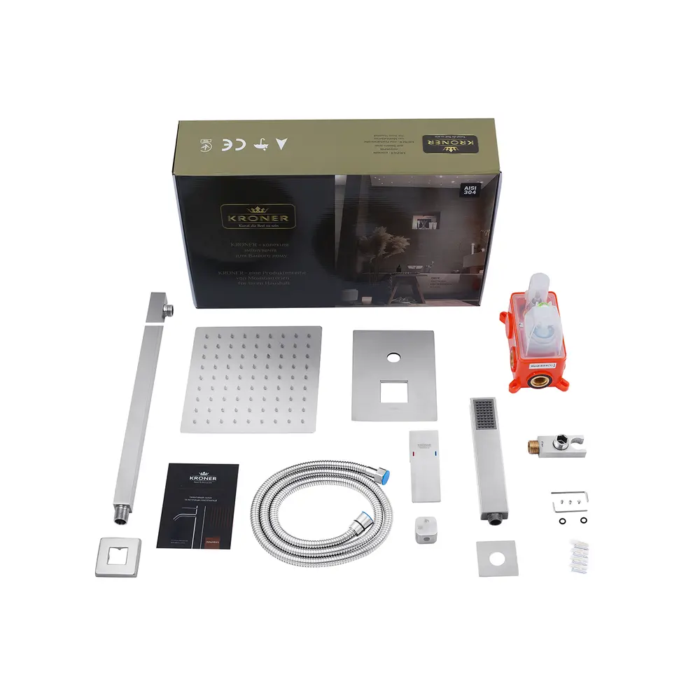 Душевой комплект скрытого монтажа Kroner KRP Edelstahl Kubus-ESG082 благодаря стильному дизайну превосходно впишется в современную ванную комнату. Душевая система изготовлена из пищевой нержавеющей стали. Ручная лейка с 1 режимом дополнена шлангом 1500 мм. Размер лейки 19х2,8х2 см. Диаметр тропического душа 20х20 см. Управление потоком осуществляется при помощи настенного рычага. Рабочий механизм – долговечный керамический картридж 35 мм. В поставку включена также внутренняя часть смесителя.