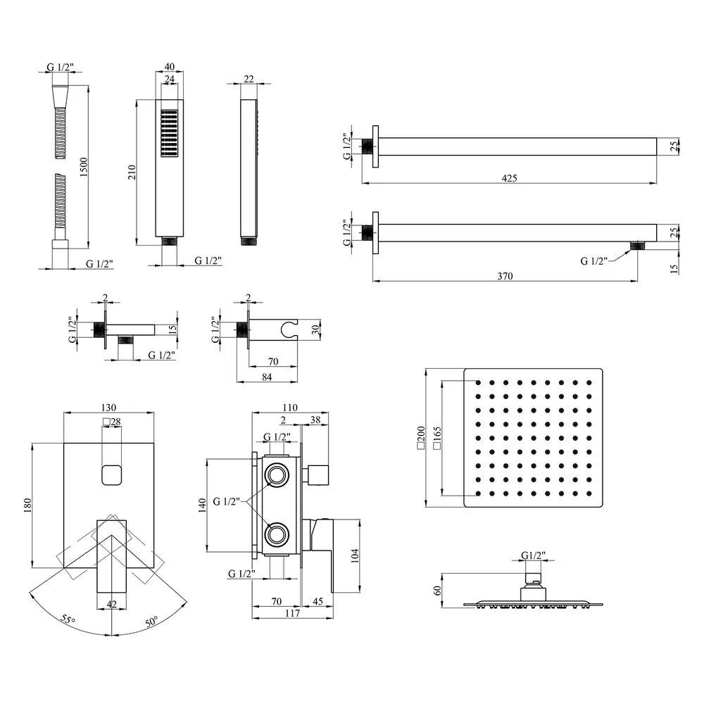 Змішувач, кронштейн для верхнього душу, лійка для верхнього душу, кронштейн для ручного душу, лійка для ручного душу, душовий шланг, кріплення.