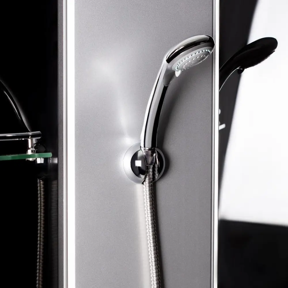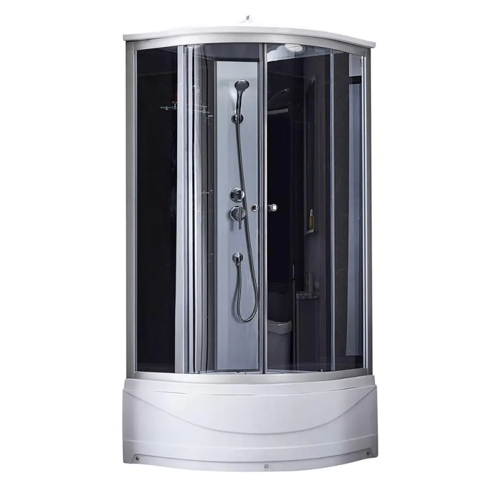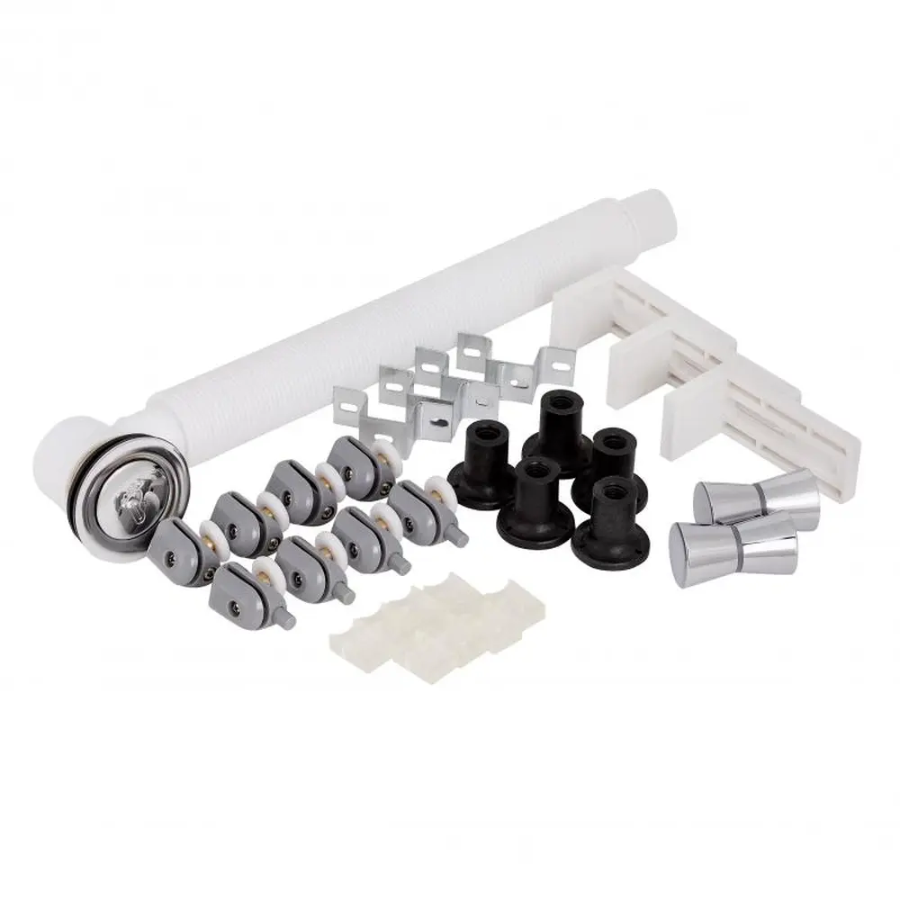 Піддон, сифон, двері, ручки, ролики, профіль, комплект кріпильних деталей, задня стінка, панель, змішувач, лійка для ручного душу, лійка для верхнього душу, душової шланг, кронштейн для ручного душа, ніжки, верхня кришка, скляна полиця, перехідник 32 /50 мм.