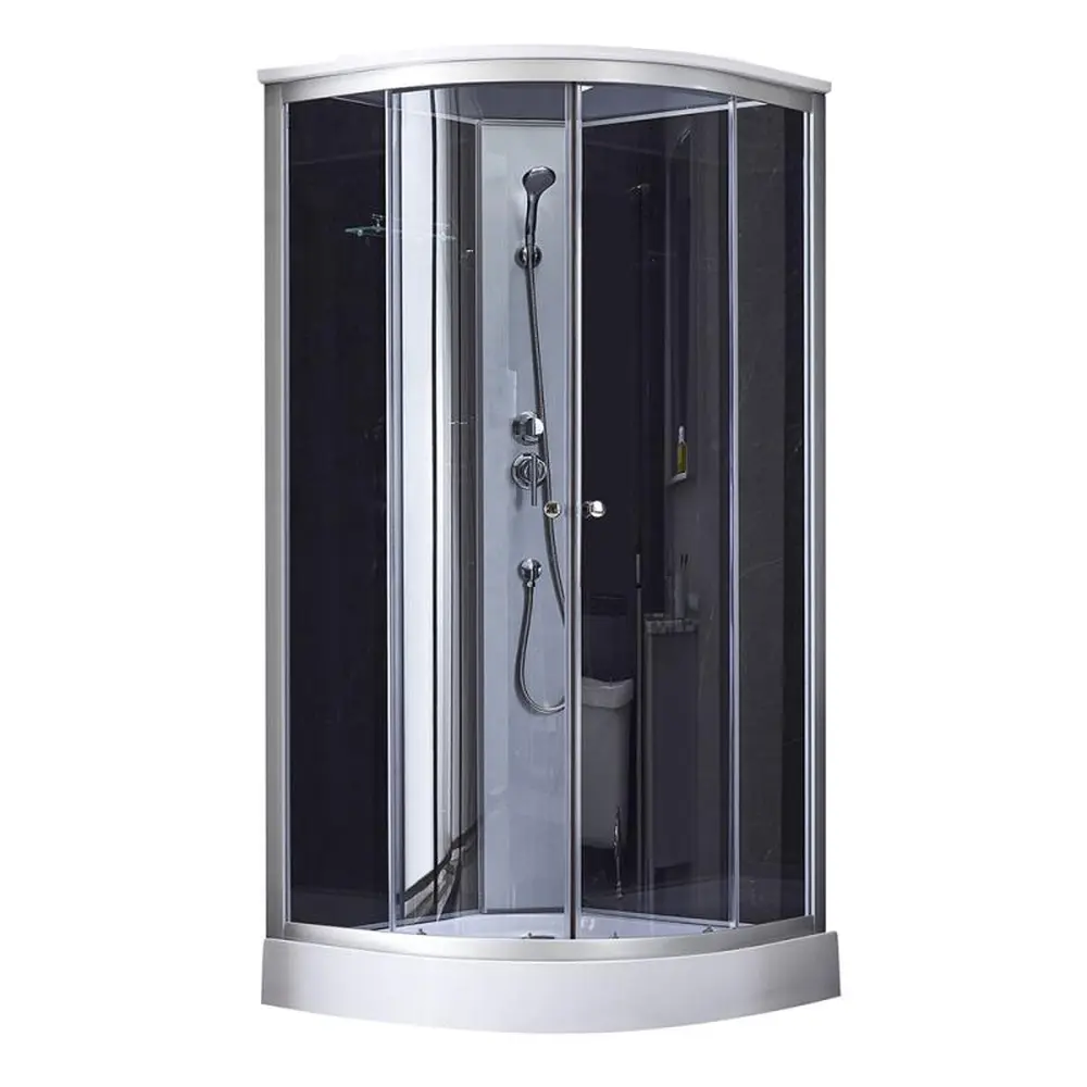Піддон, сифон, двері, ручки, ролики, профіль, комплект кріпильних деталей, задня стінка, панель, змішувач, лійка для ручного душа, лійка для верхнього душа, душової шланг, кронштейн, ніжки, верхня кришка, скляна полиця.