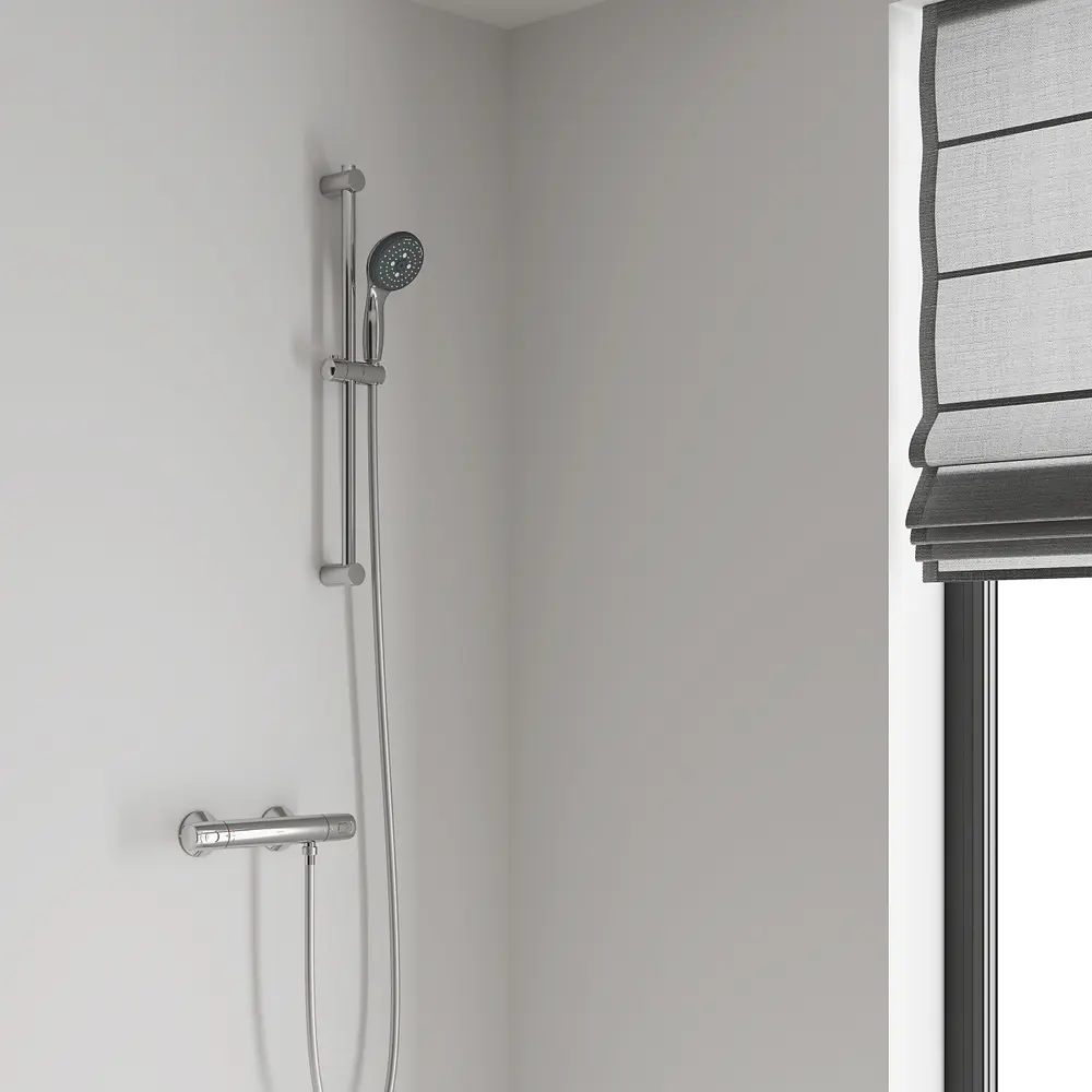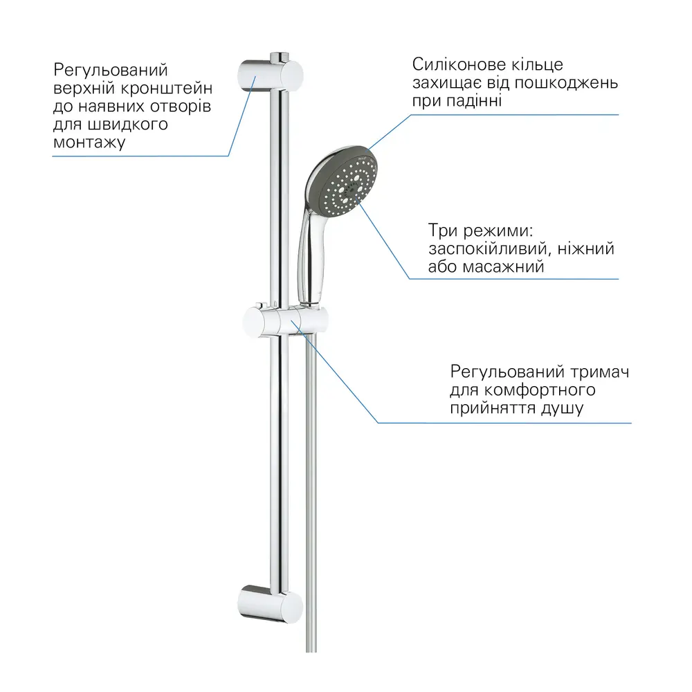 Душовий гарнітур Grohe Vitalio Start 100 виготовлений з металу, завдяки чому експлуатаційний період виробу може бути досить тривалим. Він складається з душової стійки з регульованим тримачем, лійки з діаметром 100 мм та шлангом довжиною 1750 мм. Монтується без будь-яких зусиль, встановивши стійку класичним способом на стіну за допомогою розпірників. Така модель стійки відмінно доповнить сучасний дизайн ванної кімнати.