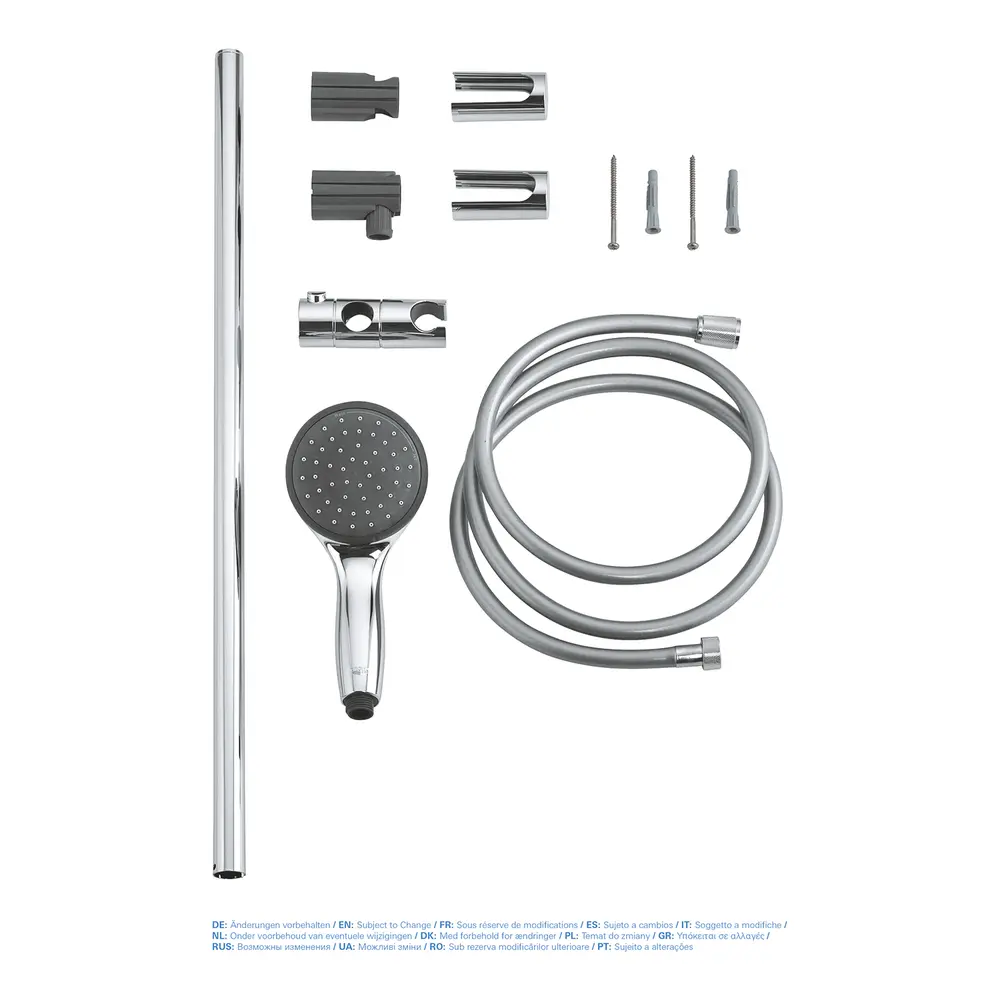Душовий гарнітур Grohe QuickFix Vitalio Start 100 27948000 виготовлений з металу, завдяки чому експлуатаційний період виробу може бути досить тривалим. Він складається з душової стійки з регульованим тримачем, лійки з діаметром 100 мм та шлангом довжиною 1750 мм. Монтується без будь-яких зусиль, встановивши стійку класичним способом на стіну за допомогою розпірників. Така модель стійки відмінно доповнить сучасний дизайн ванної кімнати.