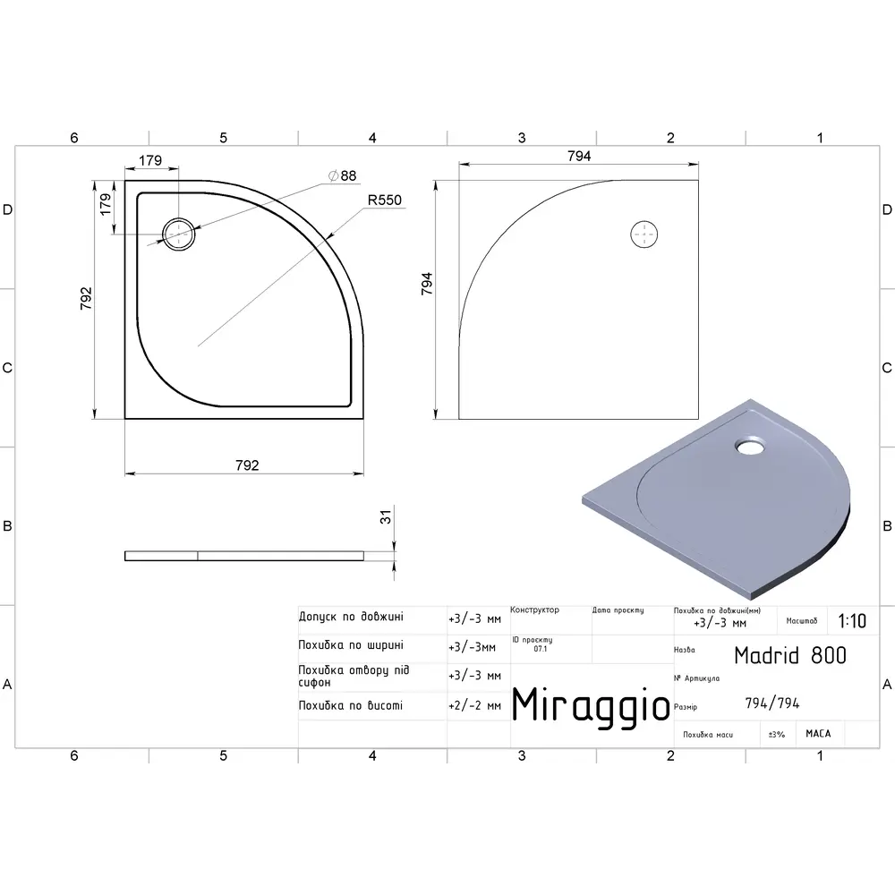 Душовий піддон MADRID 800 зі штучного каменю - надійний вибір для Вашої душової кабіни. Кутова форма піддона забезпечує щільне прилягання до стін ванної кімнати.