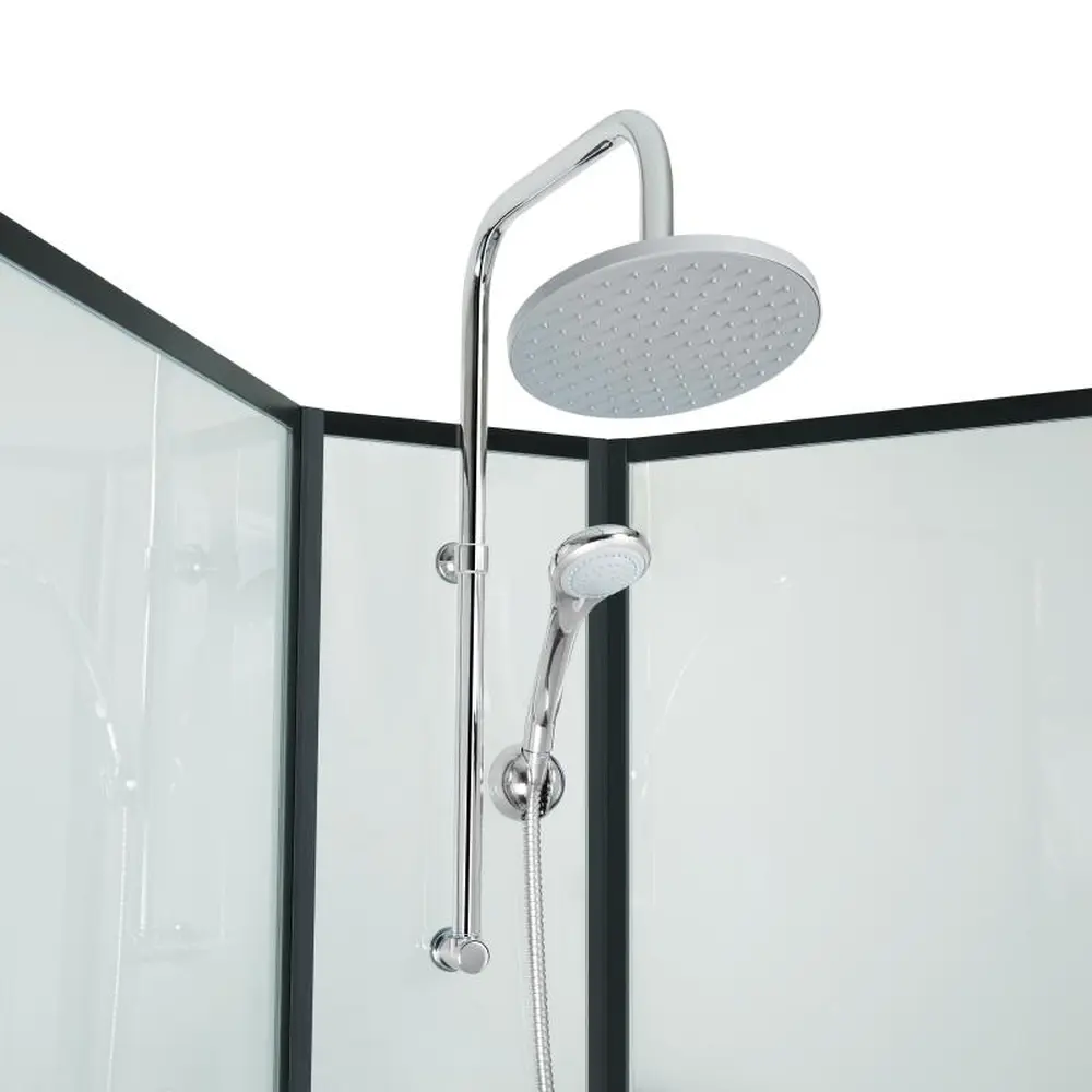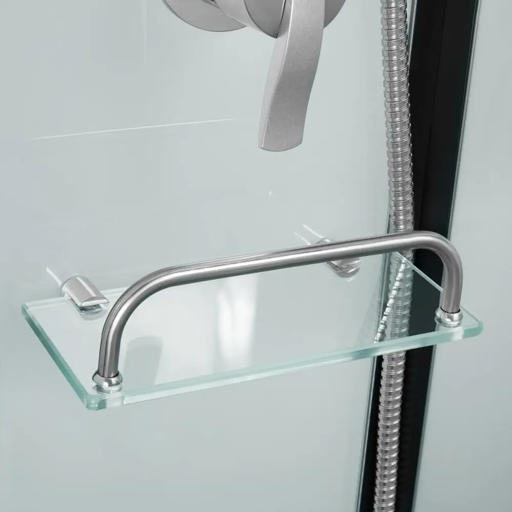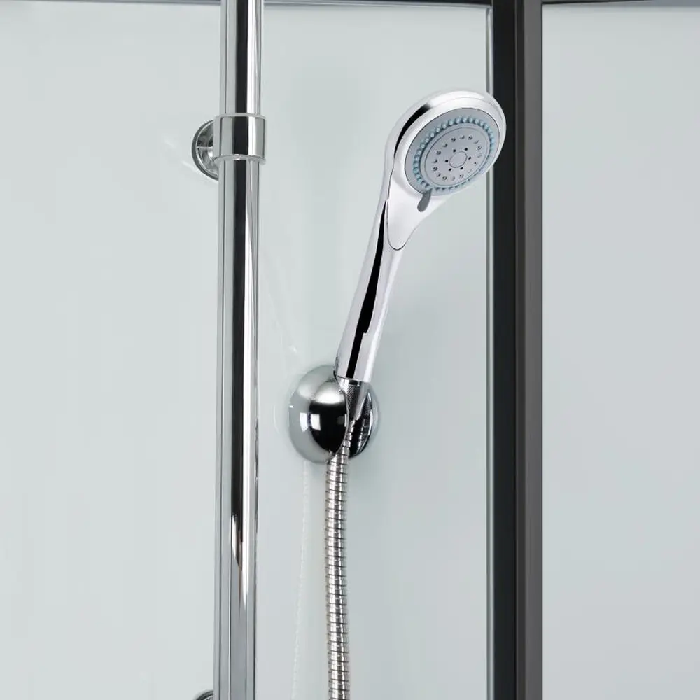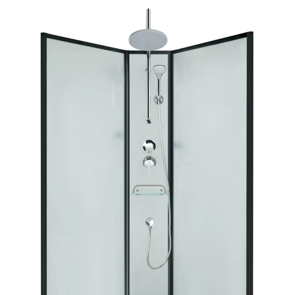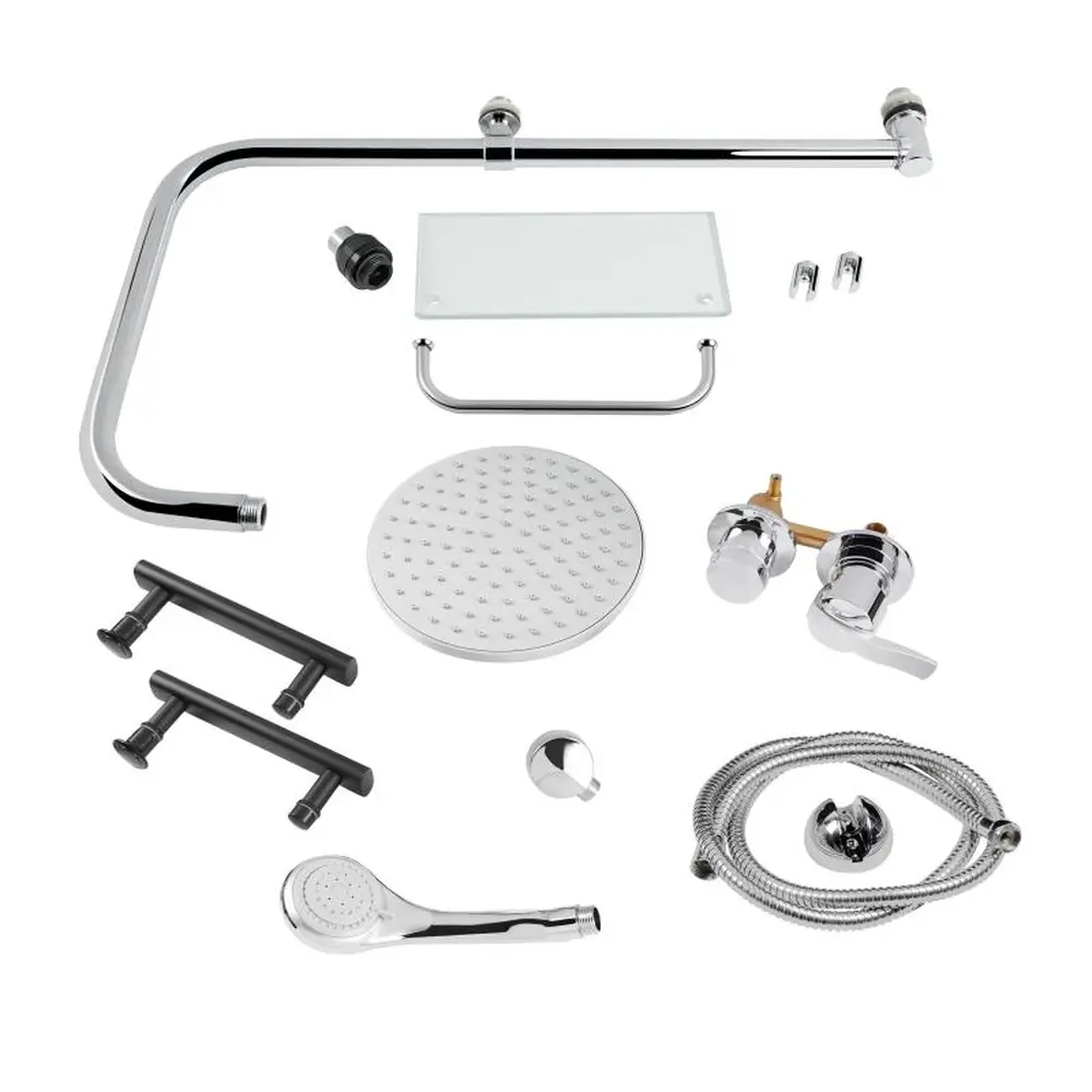 Подвійні ролики, ручки, профіль, комплект кріплень, задня стінка, глухе скло, скляні двері, душова панель, змішувач, лійка для ручного душу, лійка для верхнього душу, душовий шланг, кронштейн, скляна полиця.