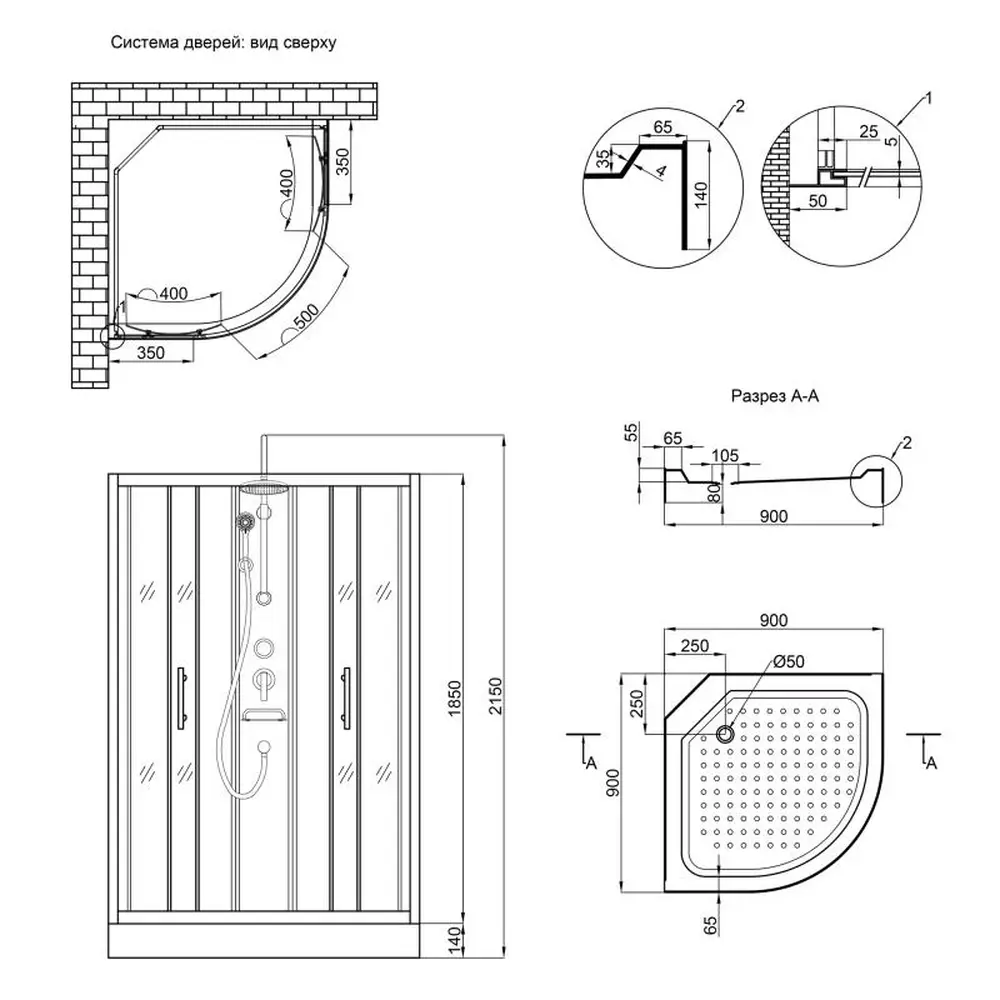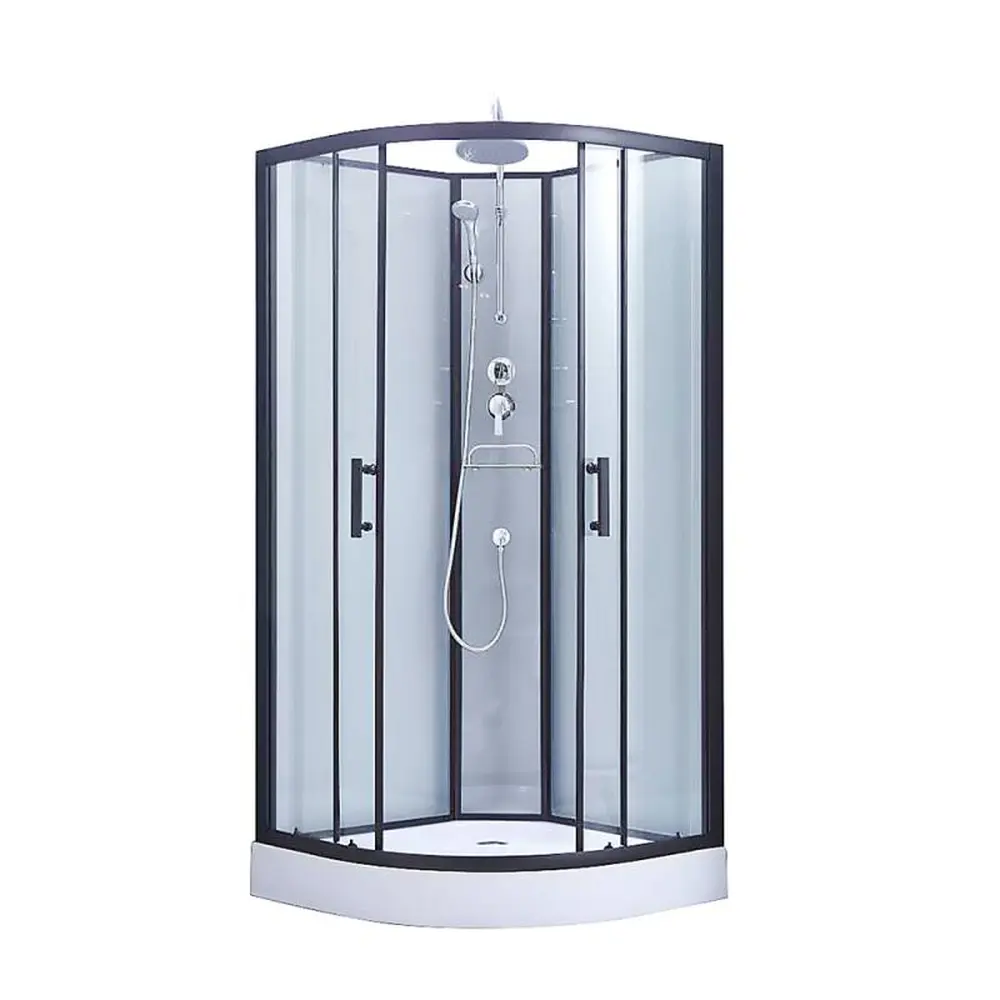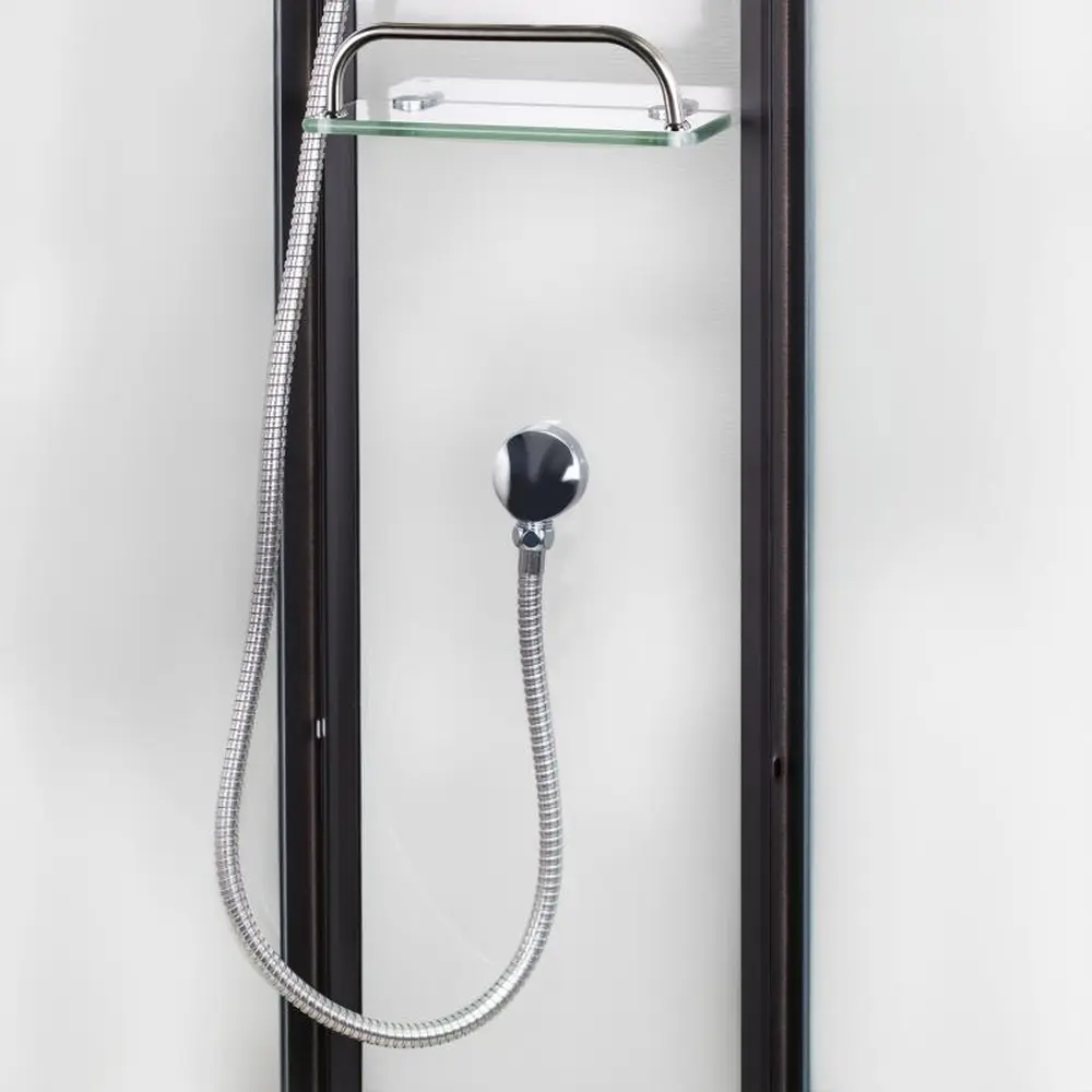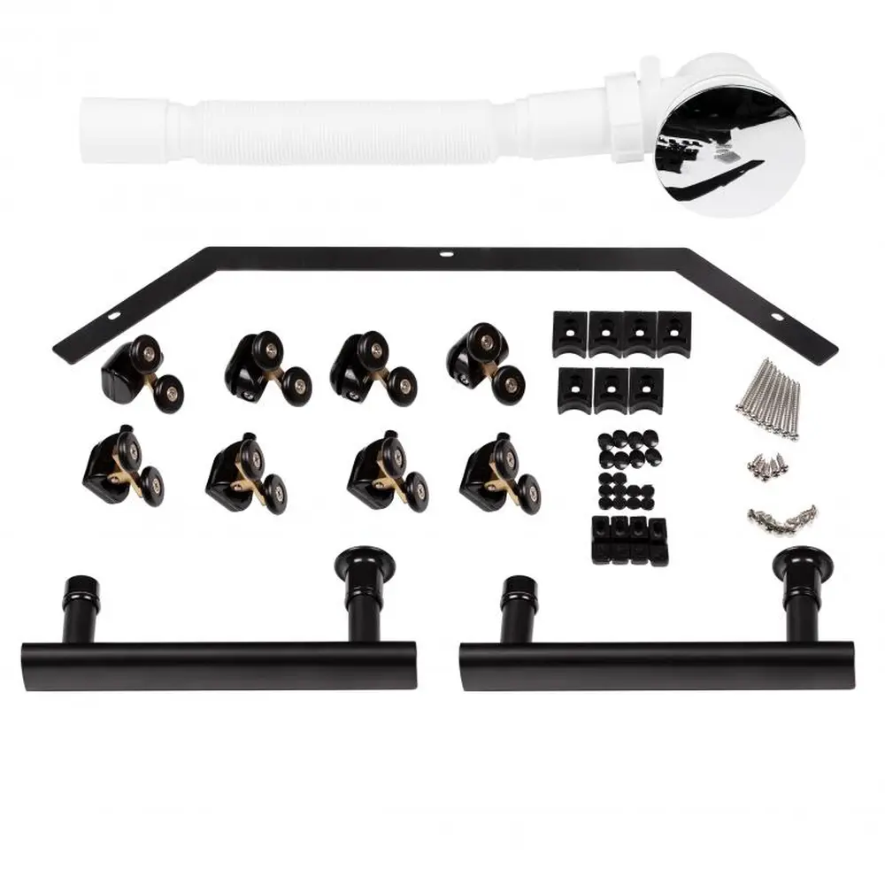 Піддон, сифон, двері, подвійні ролики, ручки, профіль, комплект кріпильних деталей, задня стінка, глухе скло, скляні двері, панель, змішувач, лійка для ручного душа, лійка для верхнього душа, душовий шланг, кронштейн, полиця, перехідник 32/50 мм.