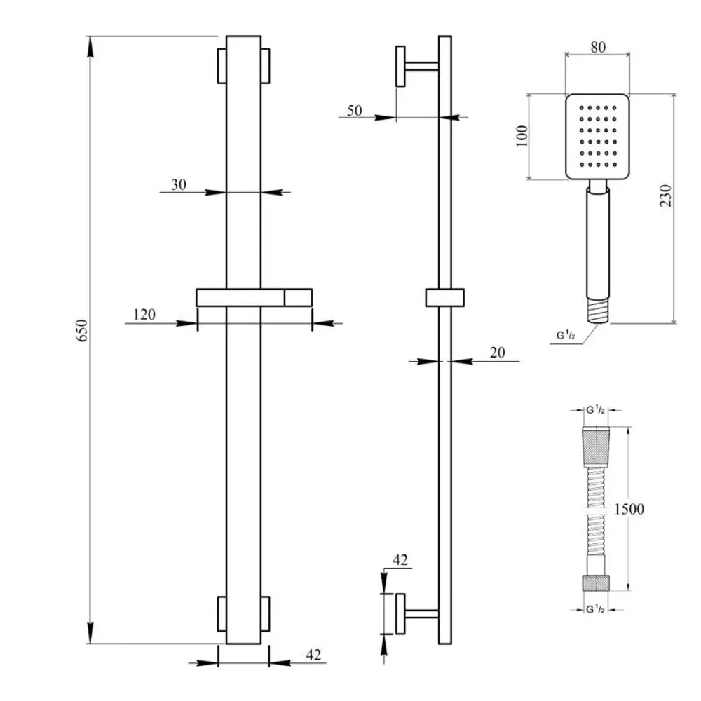 Душова стійка, кронштейн для ручного душу, лійка для ручного душу, душовий шланг, кріпильні деталі.