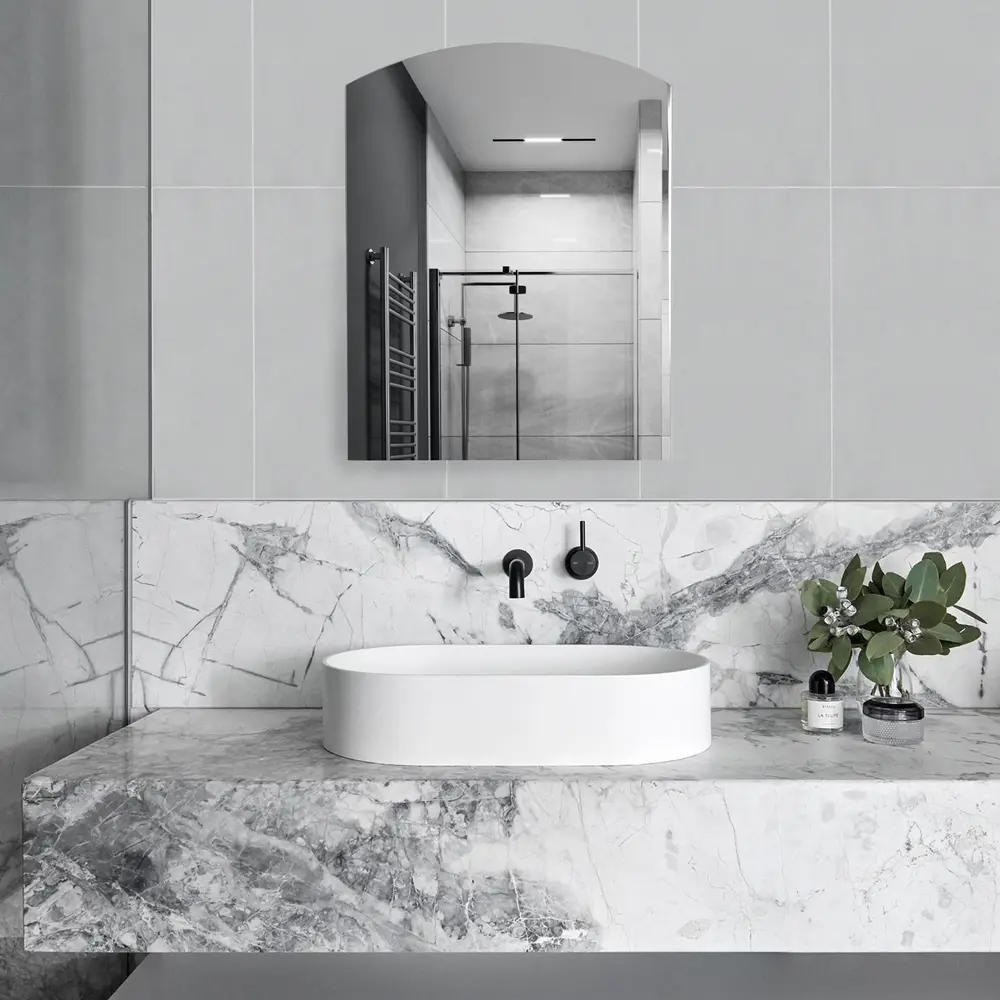 Дзеркало KRM Belantis-ACS701 від Kroner кріпиться до стіни за допомогою шурупів, які входять до комплекту. Його можна помістити над умивальником у приміщенні з будь-яким інтер'єром завдяки лаконічному дизайну. Дзеркало виготовлене з дугуватим верхом і прямими боками.