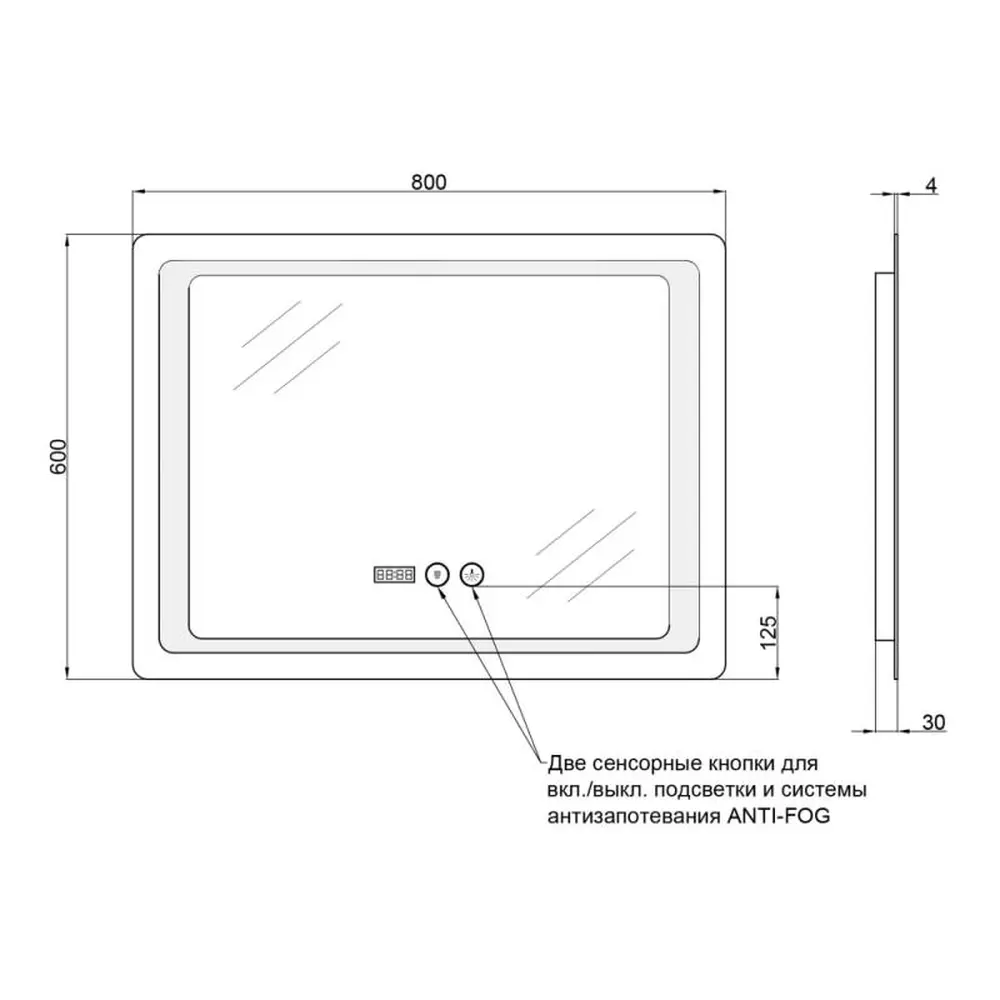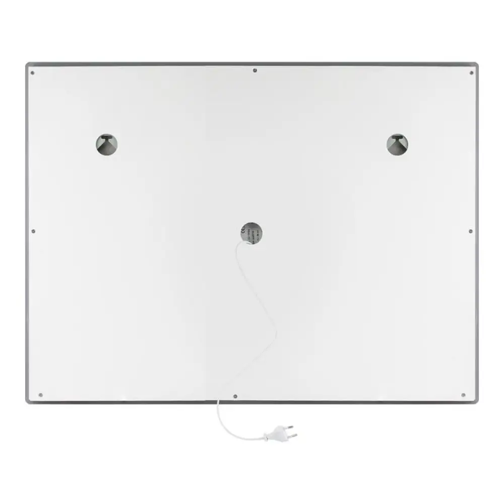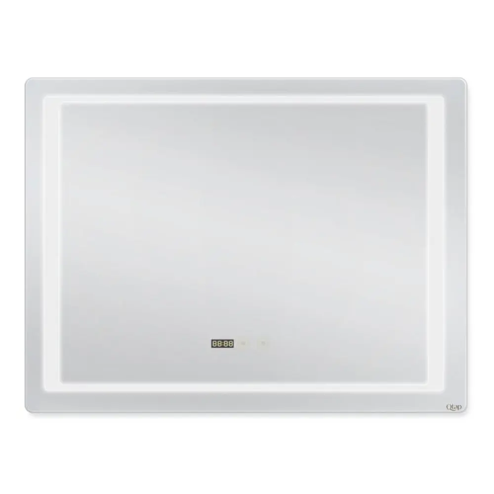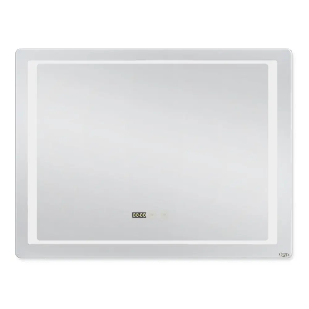Дзеркало Qtap Mideya з антизапотіванням (DC-F902-1) 800х600 QT2078F9021W укомплектоване світлодіодною LED стрічкою з рівним, насиченим, яскравим свіченням білого кольору. LED стрічка не створює негативного впливу на зір людини. У дзеркалі передбачена функція ANTI-FOG - захист від запотівання. Управління здійснюється двома сенсорними кнопками на передній частині дзеркала. У дзеркало вмонтовано годинник та індикатор температури навколишнього середовища в градусах Цельсія.
