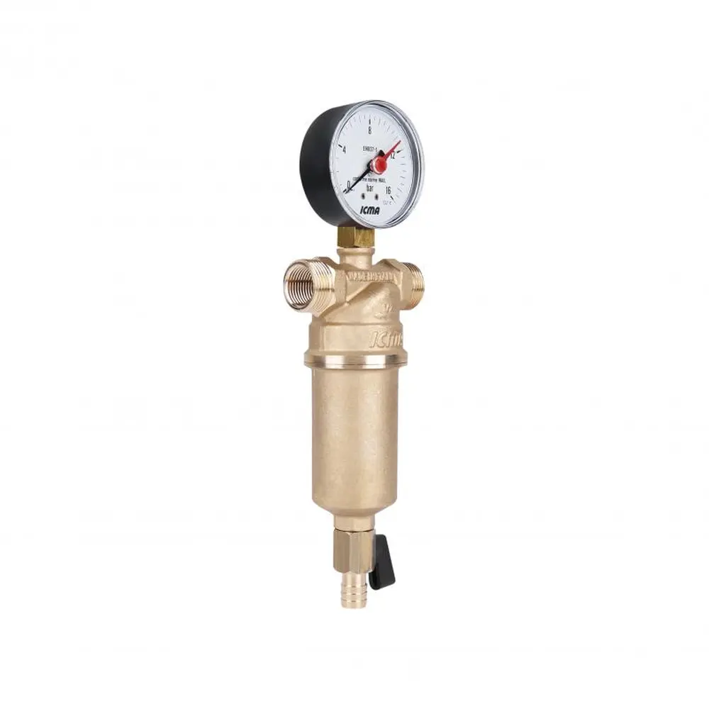 Фільтр ICMA Арт. 750 з розміром підключення 1 1/2"з х 1 1/4"в забезпечує постійну подачу фільтрованої води. Фільтр затримує забруднення нерозчинні у воді: частинки іржі, волокна паклі, пісок тощо. Компактна форма фільтрів, ідеально підходить для побутового застосування. Фільтр комплектується манометром і зливним краном. Забруднення, затримані в нижній частині фільтра зливаються через ручний зливний кран, під час промивання.