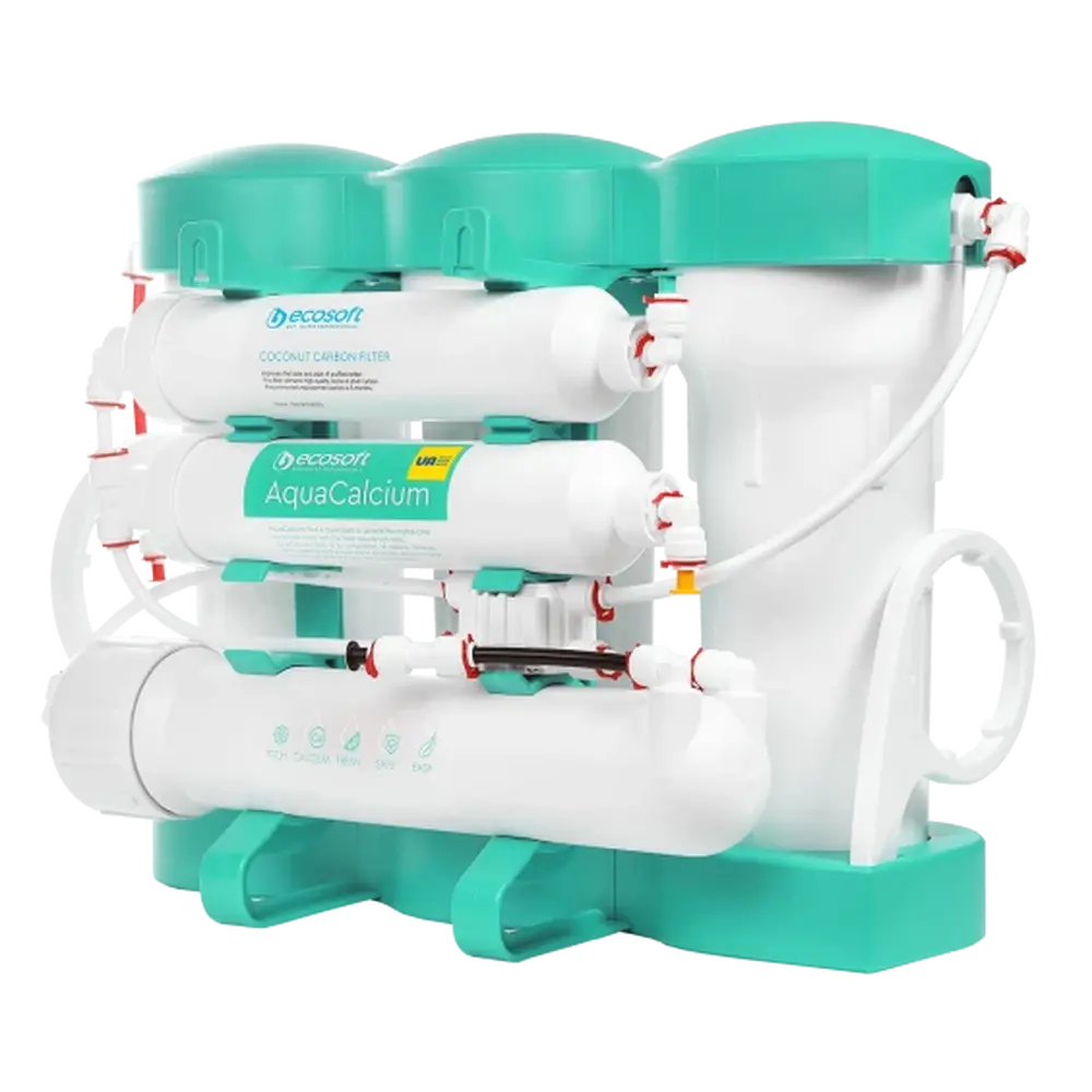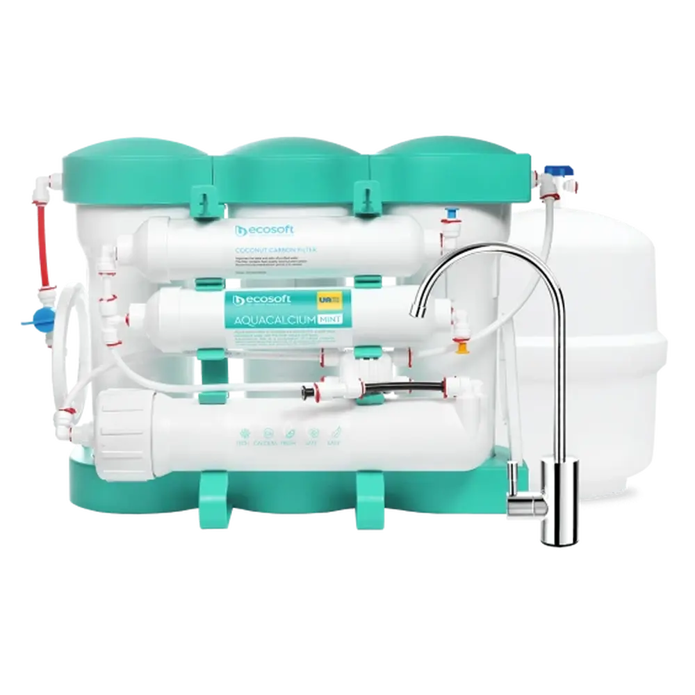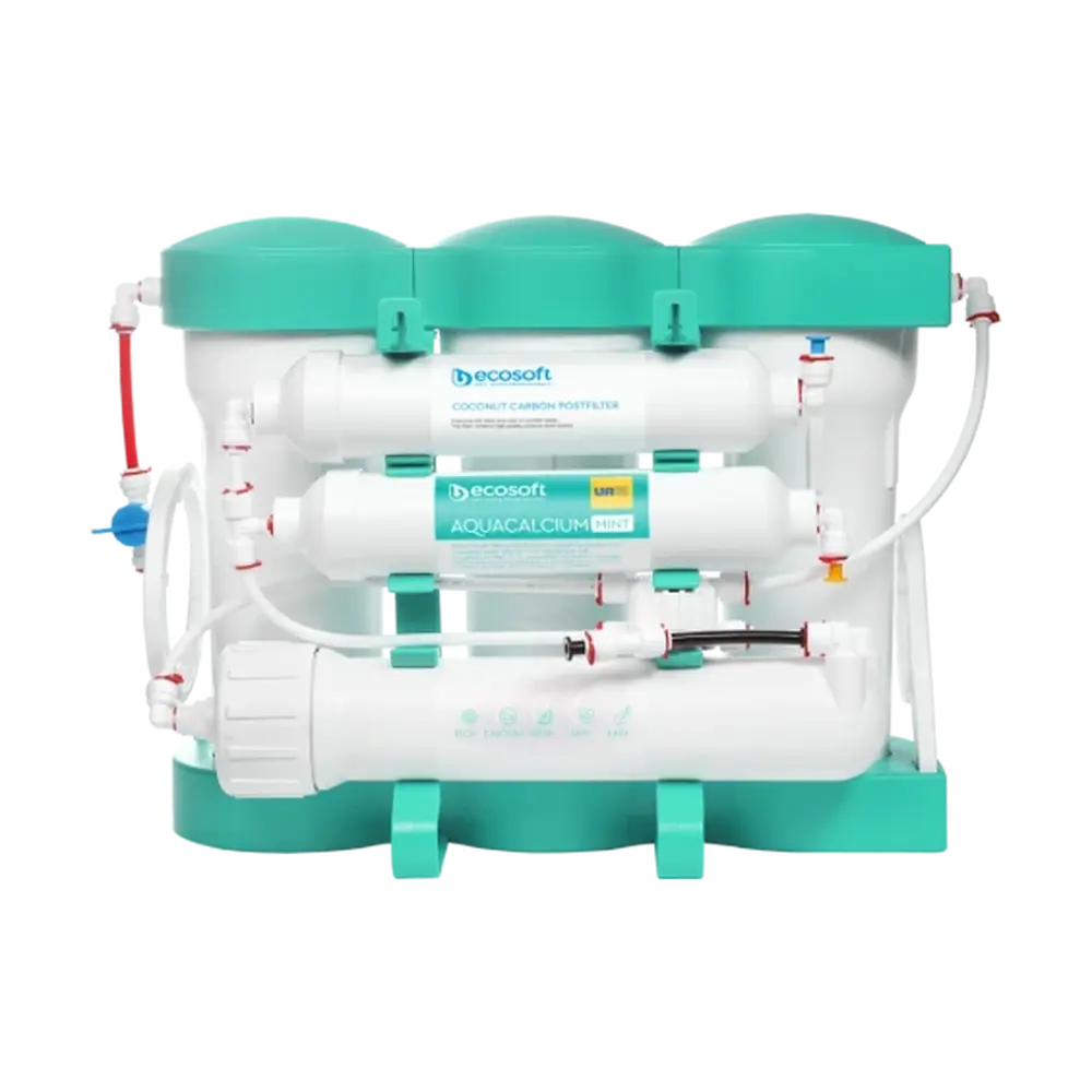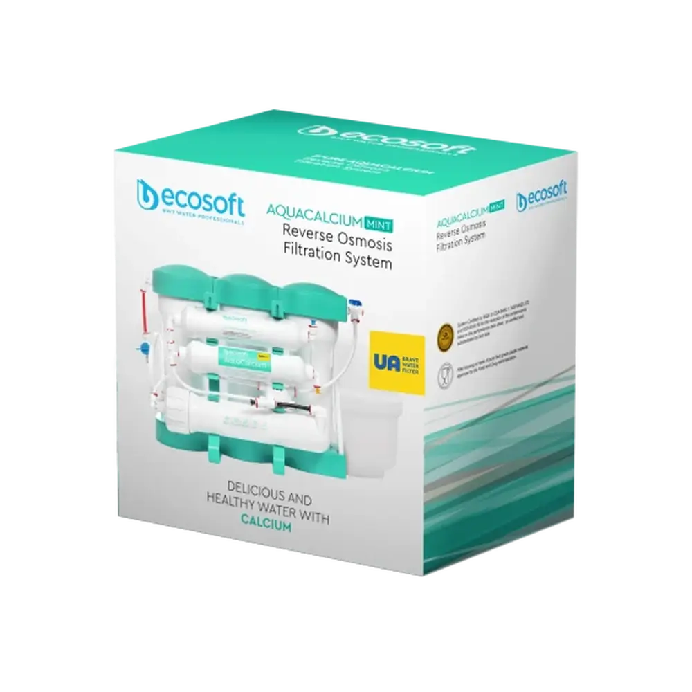 Оновлена модель фільтру зворотного осмосу Ecosoft P’URE AquaCalcium Mint також забезпечує економне споживання води. Завдяки впровадженню технології AquaGreen фільтр економить до 20 000 л води на рік в порівнянні зі стандартними системами зворотного осмосу – на 1 л очищеної води в каналізацію скидається тільки 1 л стічних вод.