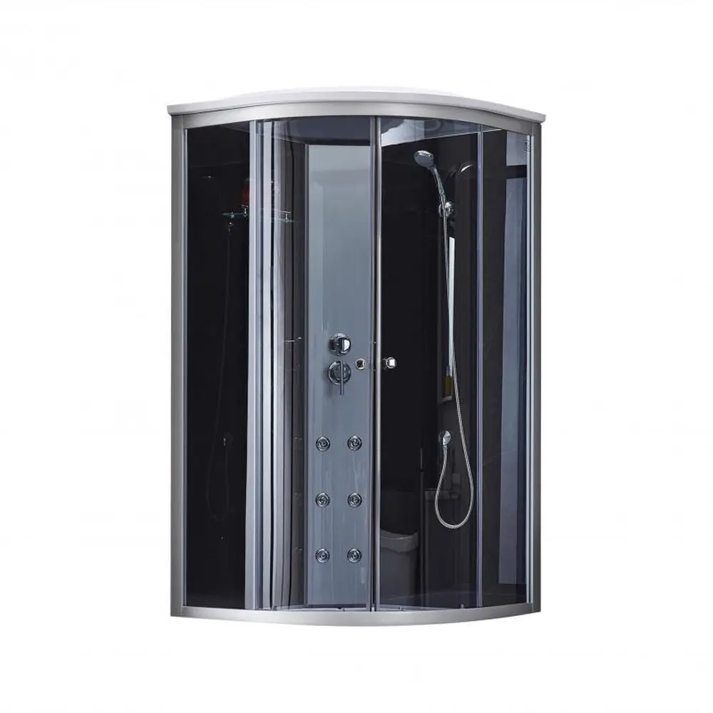 Двері, ручки, ролики, профіль, задні стінки, душова панель з гідромасажними форсунками, змішувач, лійка для ручного душу, лійка для верхнього душу, душовий шланг, кронштейн для ручного душу, шлангове під‘єднання, комплект кріпильних деталей, полиця.