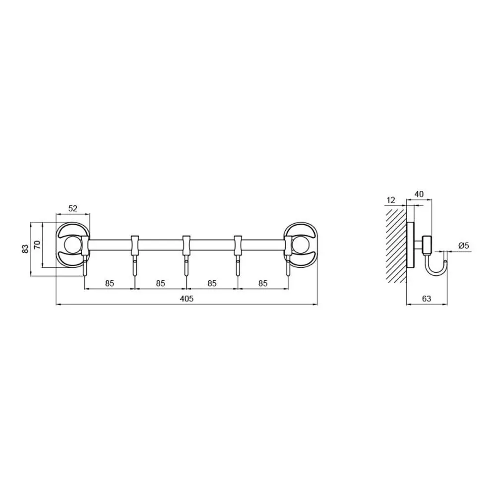Гачки - 5 шт., з‘єднувальна планка, тримачі планки - 2 шт., кріпильні деталі ( дюбель-цвях - 4 шт.).