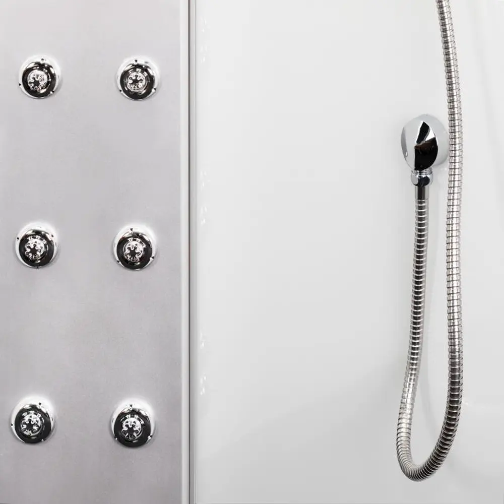 Піддон, сифон, двері, подвійні ролики, ручки, профіль, комплект кріпильних деталей, задня стінка, глухе скло, скляні двері, панель, змішувач, лійка для ручного душа, лійка для верхнього душа, душовий шланг, кронштейн, ніжки, гідромасажні форсунки, верхня кришка, перехідник 32/50 мм.