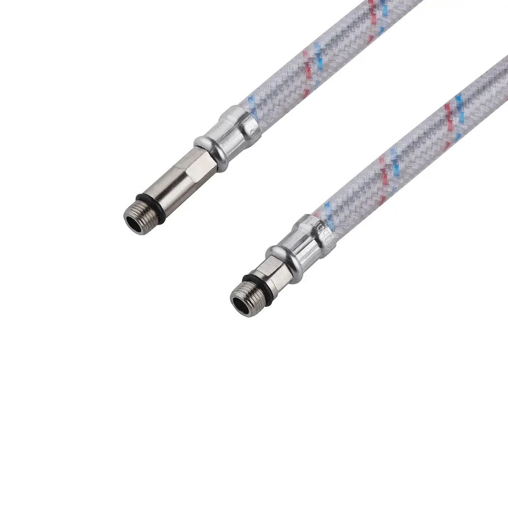 Гибкие шланги ТМ KRONER предназначены для подключения к системе водоснабжения сантехнических изделий: смесителей, проточных электрических и газовых водонагревателей, унитазов, бойлеров и др. Шланги изготавливаются из EPDM-резины высокого качества. Оплетка шланга произведена из нейлона сверху покрытого поливинилхлоридом (ПВХ), что позволяет его изогнуть под необходимым углом. Гайки и обжим сделаны из нержавеющей стали марки SUS 301. Штуцеры и сердечники сделаны из высококачественной латуни марки ЛС58-3. При температуре 95 ℃ максимальное рабочее давление 10 Бар. Давление на разрыв составляет 50 Бар при температуре до 60 ℃.