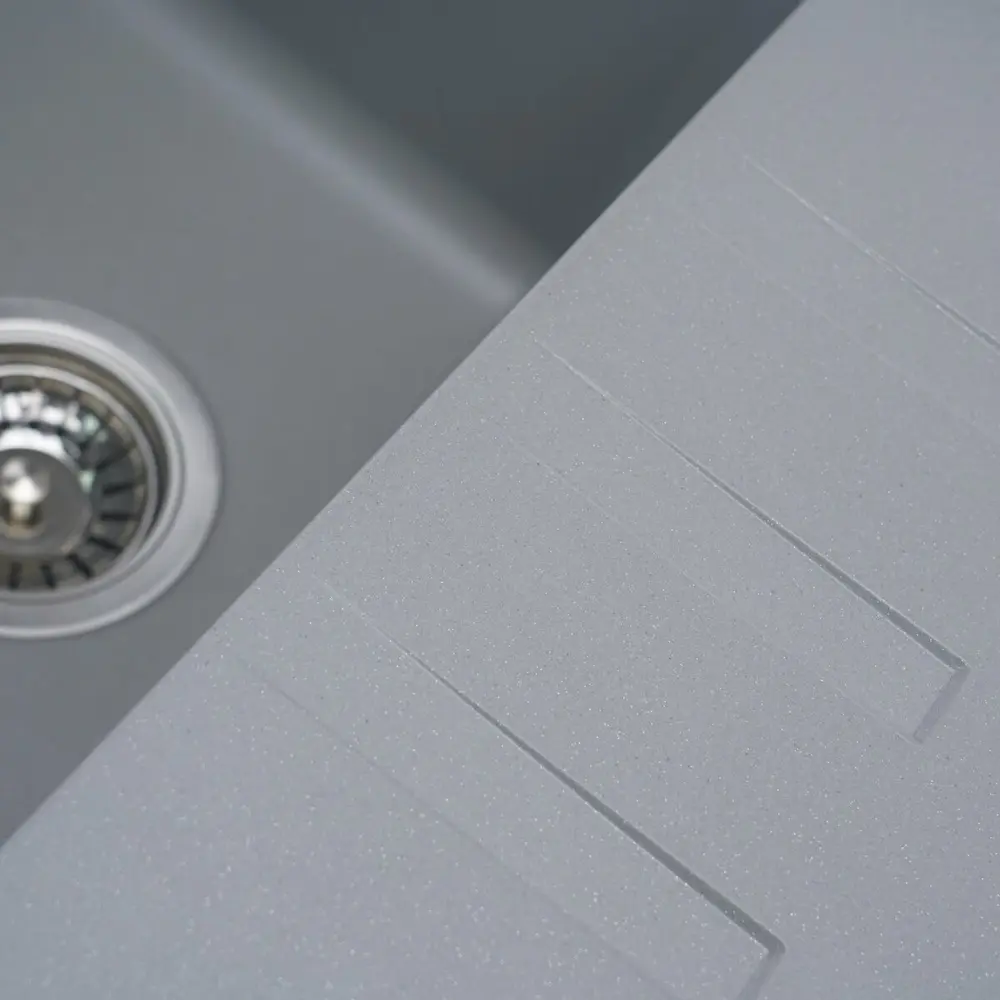 Мойка имеет матовую фактуру и приятный для глаза цвет - серый металлик, что позволяет ей легко вписаться в интерьер кухни.