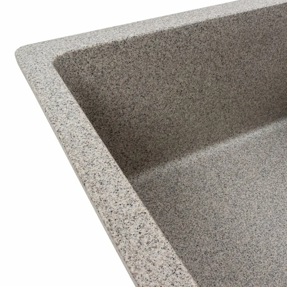 Мойка на 80% состоит из кварца и на 20% из очень жесткой акриловой смолы, благодаря чему неприхотлива в уходе, а также имеет большой запас прочности.