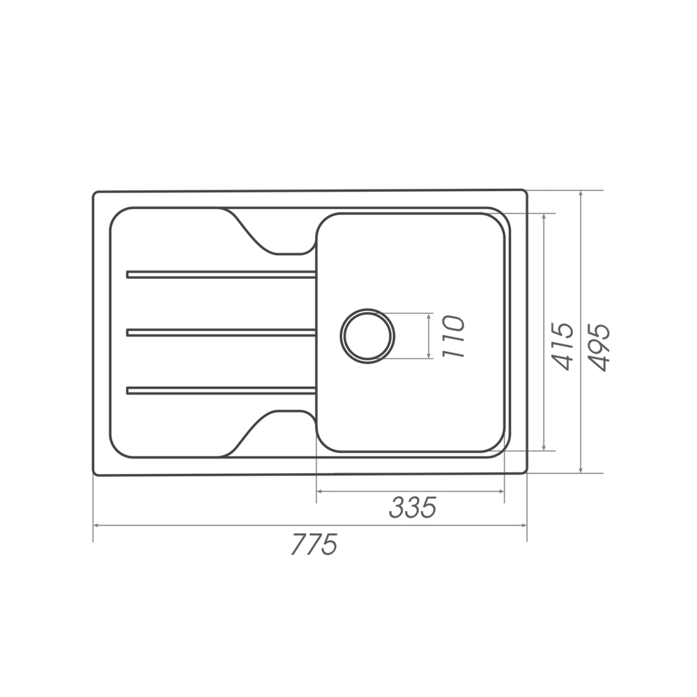 Размеры мойки – 775х497х180 мм, вес – 12 кг, сифон - евросифон с широкой горловиной, 110 мм.