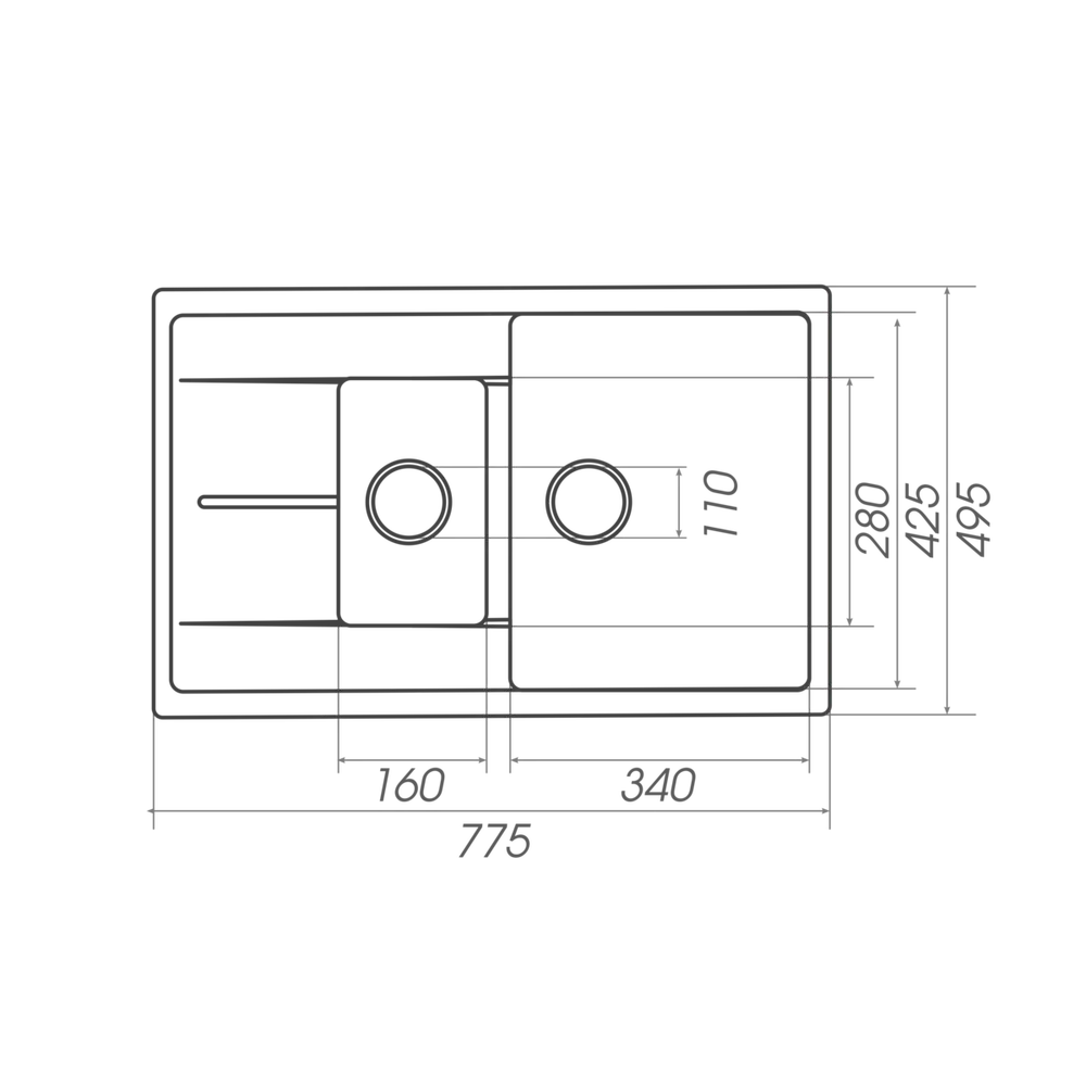 Размеры мойки – 775х495х190 мм, вес – 14,2 кг, сифон - евросифон с широкой горловиной, 110 мм.