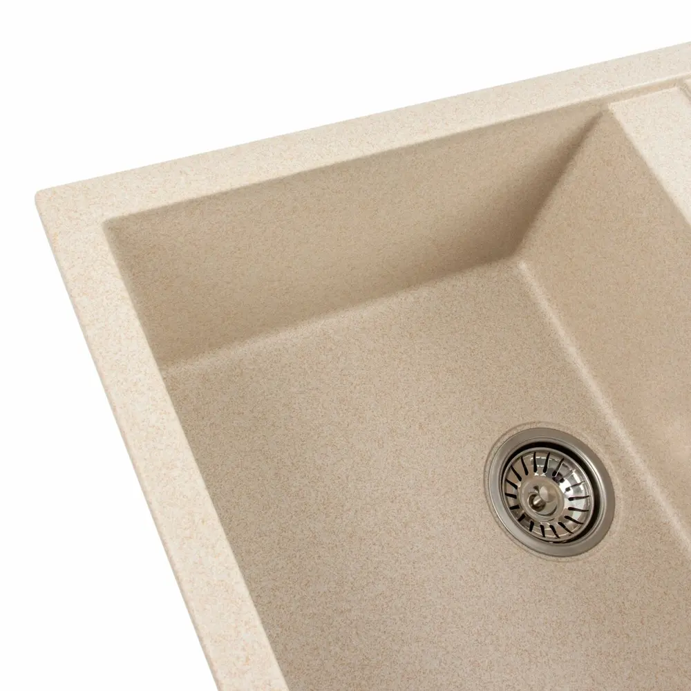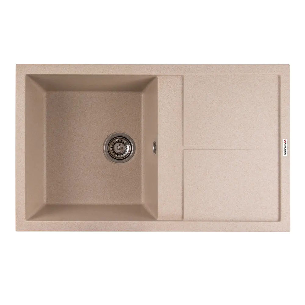 Гранитная мойка для кухни 7950 SELENA украинского бренда VALESO – это стильная, врезная, прямоугольная мойка, которая своим видом прекрасно дополнит дизайн вашей кухни. Мойка на 80% состоит из кварца и на 20% из очень жесткой акриловой смолы, благодаря чему неприхотлива в уходе, а также имеет большой запас прочности. Размеры чаши, 377x430x200 мм, делают ее очень вместительной и удобной в использовании. Монтаж производится врезным способом в кухонный шкаф шириной не менее 500 мм. Мойка имеет матовую фактуру и приятный для глаза цвет позволяющий ей легко вписаться в интерьер кухни. Мойка изготовлена в Украине из качественного немецкого сырья по технологии Solid Surface с соблюдением всех необходимых стандартов.
