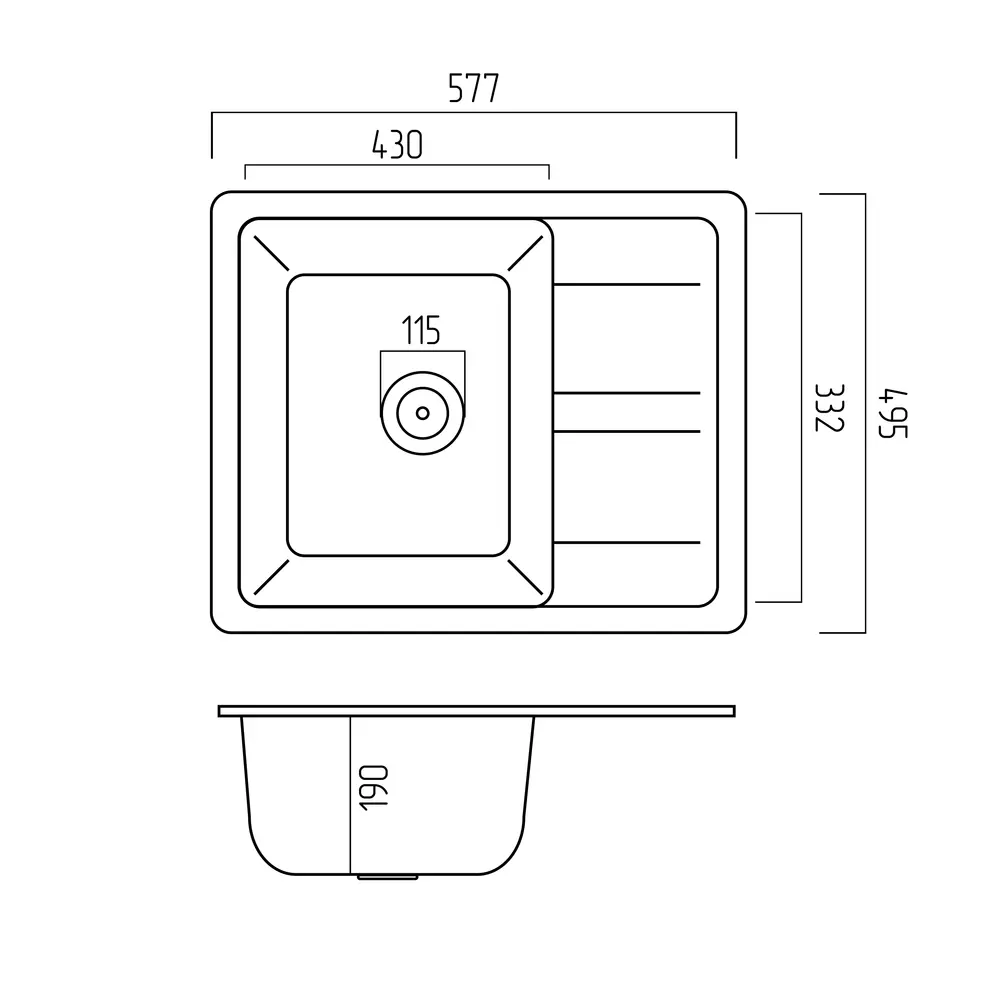 Розміри мийки – 577x495х190 мм, вага – 10 кг, сифон – євросифон з широкою горловиною, 110 мм.