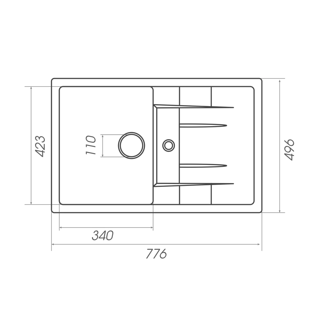 Розміри мийки – 776x496х180 мм, вага – 13.3 кг, сифон – євросифон з широкою горловиною, 110 мм.