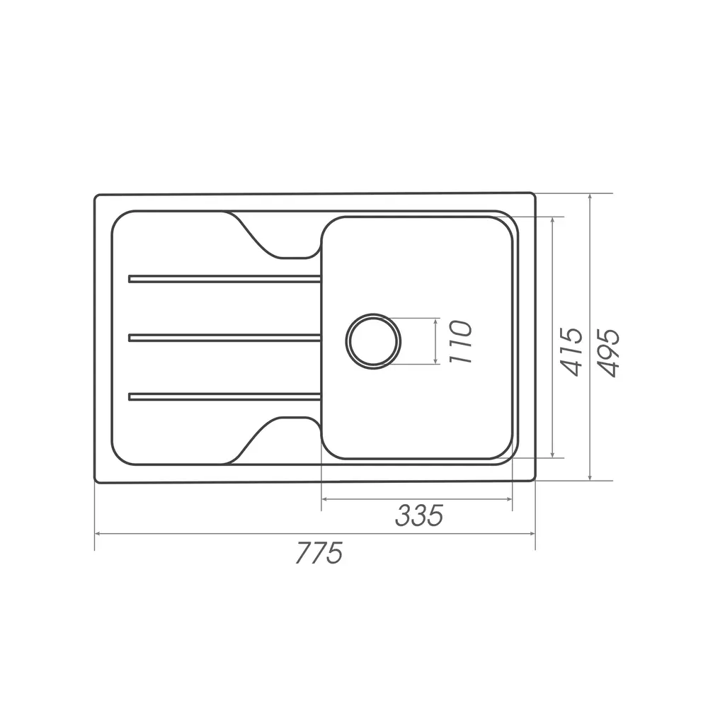 Розміри мийки – 775х497х180 мм, вага – 12 кг, сифон – євросифон з широкою горловиною, 110 мм.