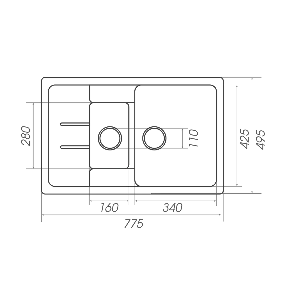 Розміри мийки – 775x495х190 мм, вага – 13.5 кг, сифон – євросифон з широкою горловиною, 110 мм.