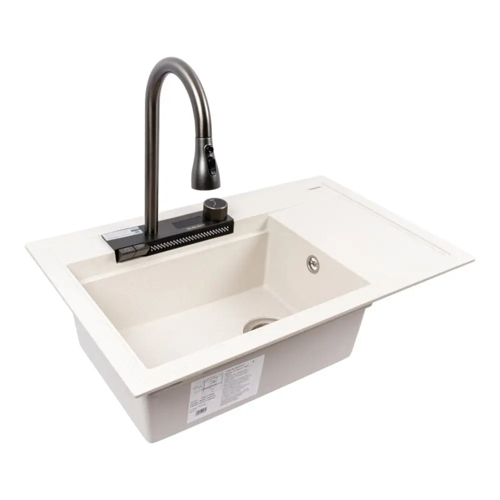 Мойка врезного типа — устанавливается в вырез столешницы, обеспечивая аккуратный вид и лёгкость в уходе. В комплект входит стильный смеситель, а также предусмотрен отдельный режим «водопад», который особенно удобен для мытья фруктов, овощей и наполнения ёмкостей мягким, направленным потоком воды.