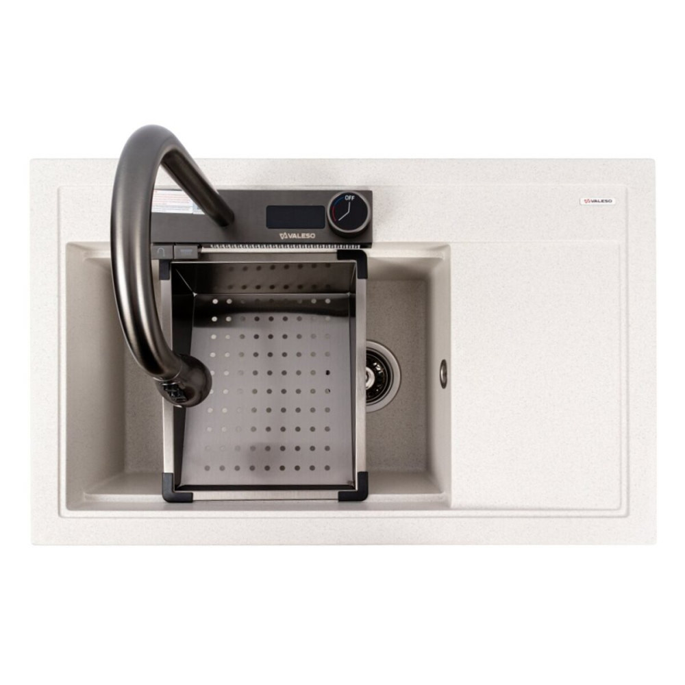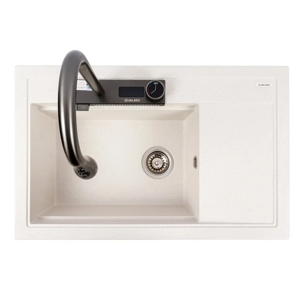 Гранитная мойка VALESO 7950 ATRUM в цвете белый в точку— это удачное сочетание современного дизайна, надёжности и удобства. Она изготовлена из прочного гранитного композита, устойчивого к царапинам, перепадам температур и бытовой химии. Матовая поверхность придаёт изделию элегантный внешний вид и легко очищается.