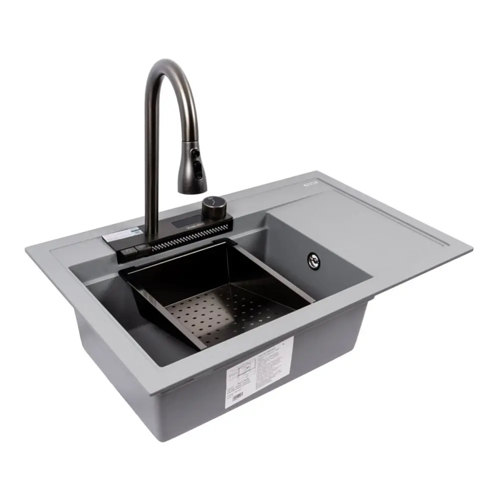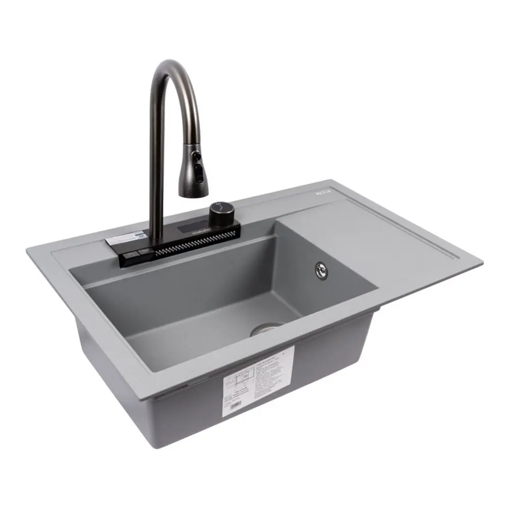 Мойка врезного типа — устанавливается в вырез столешницы, обеспечивая аккуратный вид и лёгкость в уходе. В комплект входит стильный смеситель, а также предусмотрен отдельный режим «водопад», который особенно удобен для мытья фруктов, овощей и наполнения ёмкостей мягким, направленным потоком воды.