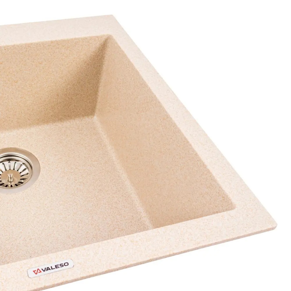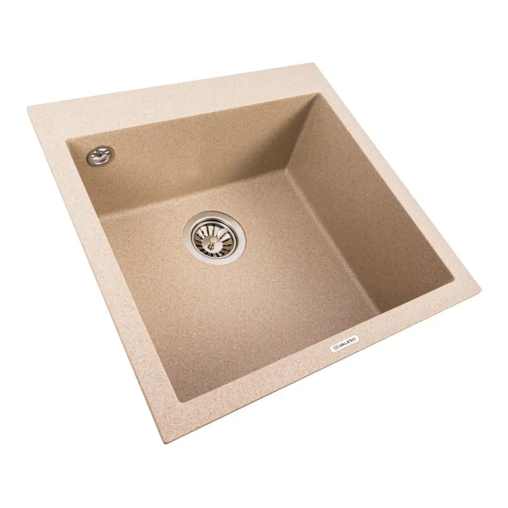 Размер мойки — 500×500 мм, глубина чаши — 200 мм, что обеспечивает комфортное использование даже при мытье габаритной посуды. Мойка изготовлена из прочного искусственного камня на основе гранитной крошки, устойчива к механическим повреждениям, высокой температуре и агрессивной бытовой химии.