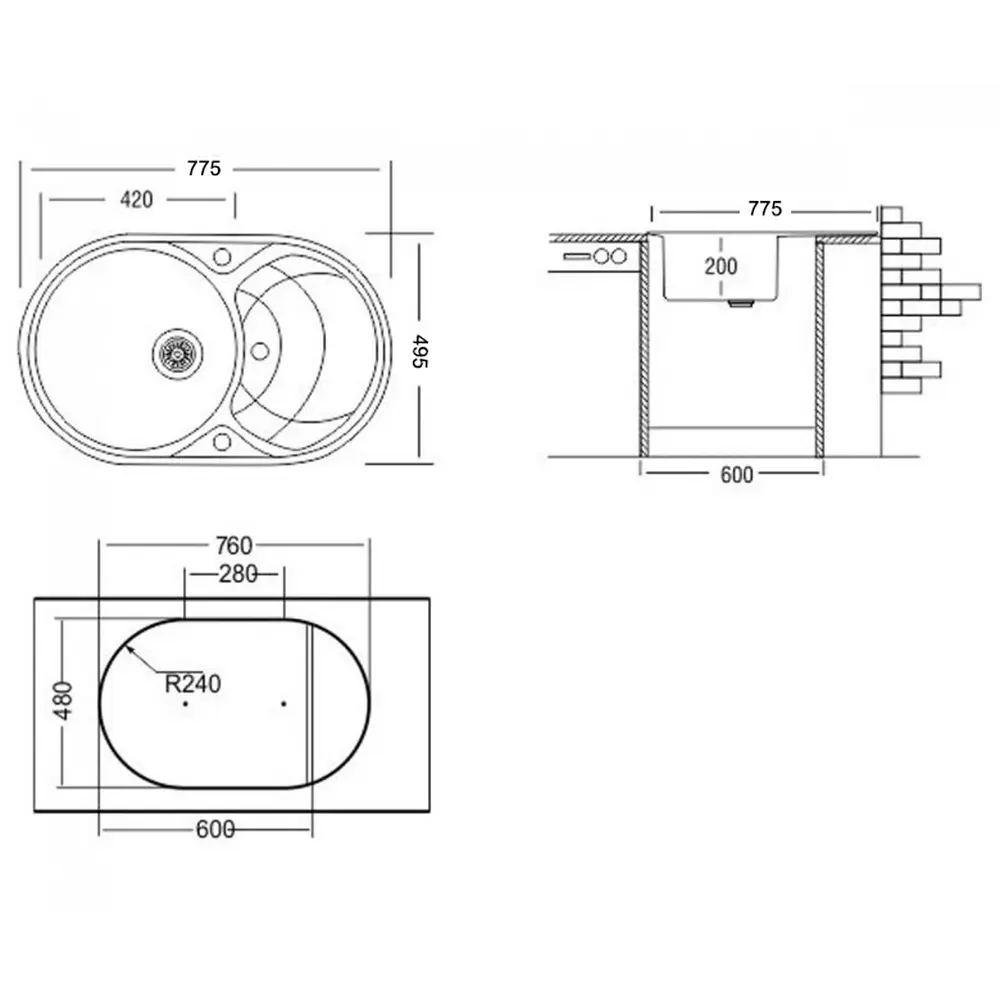 Ширина чаші мийки, мм