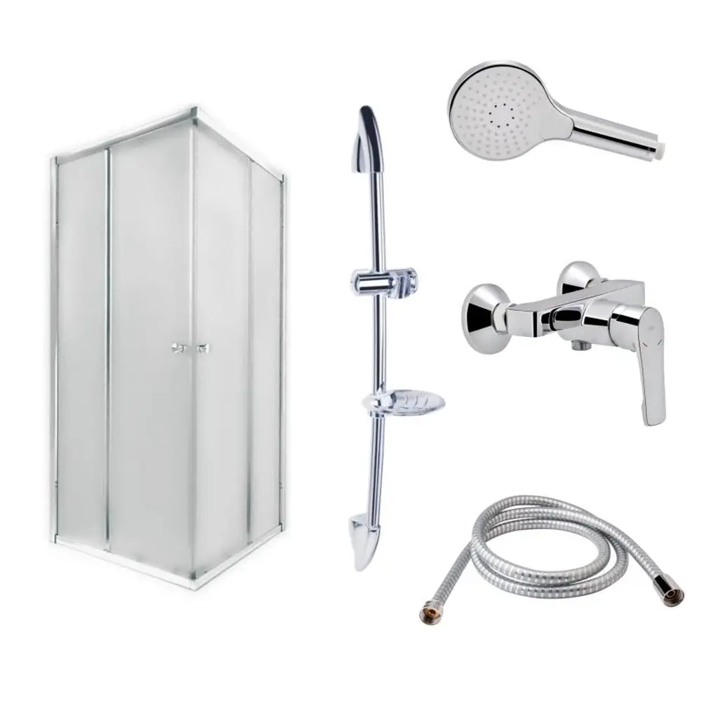 Подвійні ролики, ручки, верхній профіль, нижній профіль, бічні профілі, набір ущільнювачів, розширювальні профілі, 2 скляні двері, 2 глухі скла, комплект кріплень, заглушки, що з‘єднують елементи, фіксатори. Змішувач, захист гайок від подряпин. Кріплення. Штанга для душу, кронштейн для ручного душу, мильниця, кріплення. Душовий шланг, лійка для ручного душу, зворотний клапан.