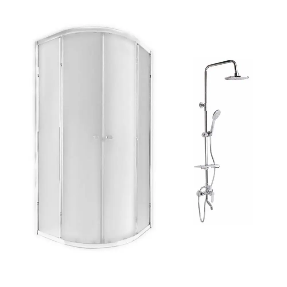 Подвійні ролики, ручки, верхній профіль, нижній профіль, бічні профілі, набір ущільнювачів, розширювальні профілі, 2 скляні двері, 2 глухі скла, комплект кріплень, заглушки, елементи, що з‘єднують, фіксатори. Змішувач, кронштейн для верхнього душу, лійка для верхнього душу, кронштейн для ручного душу, лійка для ручного душу, душовий шланг, душова стійка, полиця, кріплення.