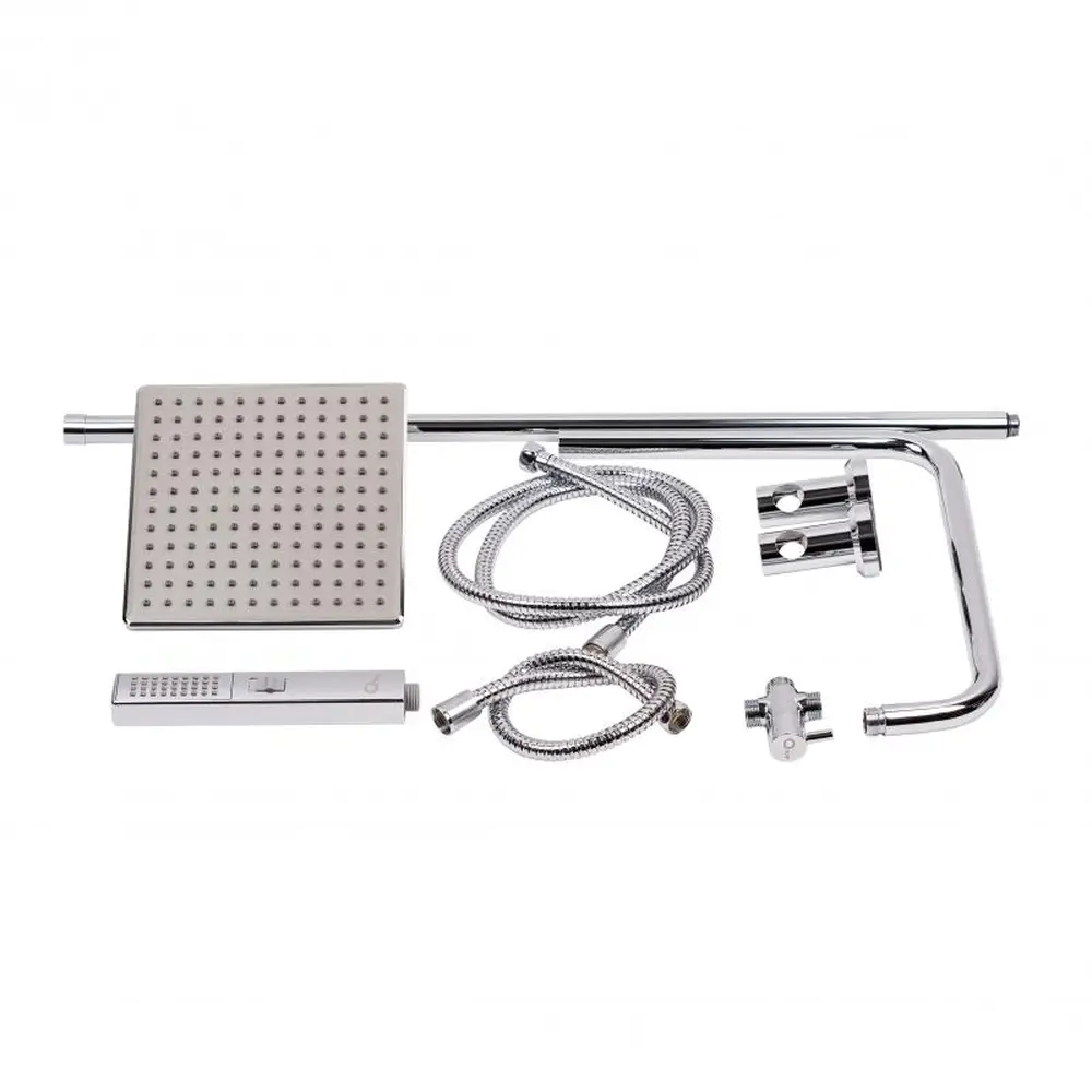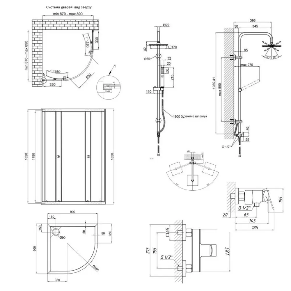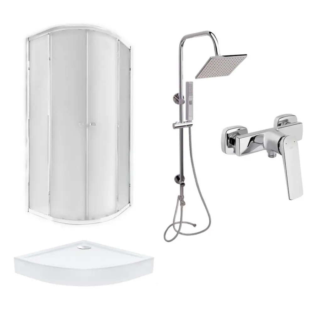 Подвійні ролики, ручки, верхній профіль, нижній профіль, бічні профілі, набір ущільнювачів, розширювальні профілі, 2 скляні двері, 2 глухі скла, комплект кріплень, заглушки, елементи, що з‘єднують, фіксатори. Піддон, ніжки, сифон із гідрозатвором. Кронштейн для верхнього душу, лійка для верхнього душу, кронштейн для ручного душу, лійка для ручного душу, душовий шланг, душова стійка, шлангове підключення, кріплення. Змішувач, кріплення.