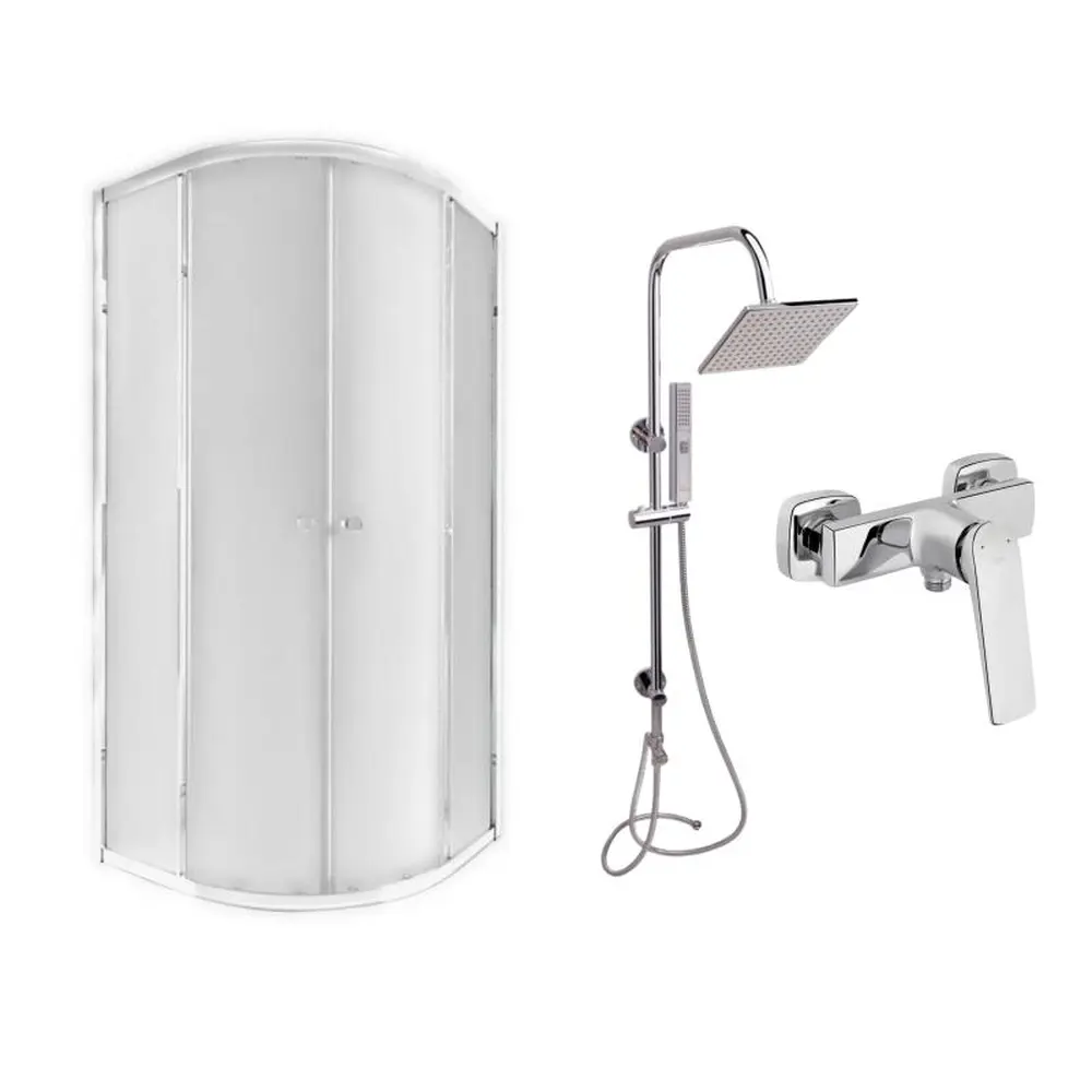Подвійні ролики, ручки, верхній профіль, нижній профіль, бічні профілі, набір ущільнювачів, розширювальні профілі, 2 скляні двері, 2 глухі скла, комплект кріплень, заглушки, елементи, що з‘єднують, фіксатори. Кронштейн для верхнього душу, лійка для верхнього душу, кронштейн для ручного душу, лійка для ручного душу, душовий шланг, душова стійка, шлангове підключення, кріплення. Змішувач, кріплення.