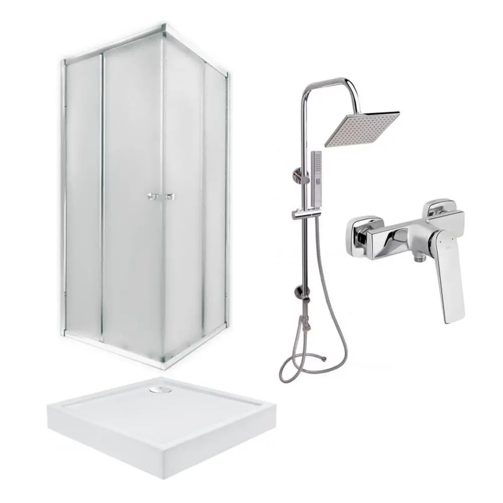 Подвійні ролики, ручки, верхній профіль, нижній профіль, бічні профілі, набір ущільнювачів, розширювальні профілі, 2 скляні двері, 2 глухі скла, комплект кріплень, заглушки, елементи, що з‘єднують, фіксатори. Піддон, ніжки, сифон із гідрозатвором. Кронштейн для верхнього душу, лійка для верхнього душу, кронштейн для ручного душу, лійка для ручного душу, душовий шланг, душова стійка, шлангове підключення, кріплення. Змішувач, кріплення.