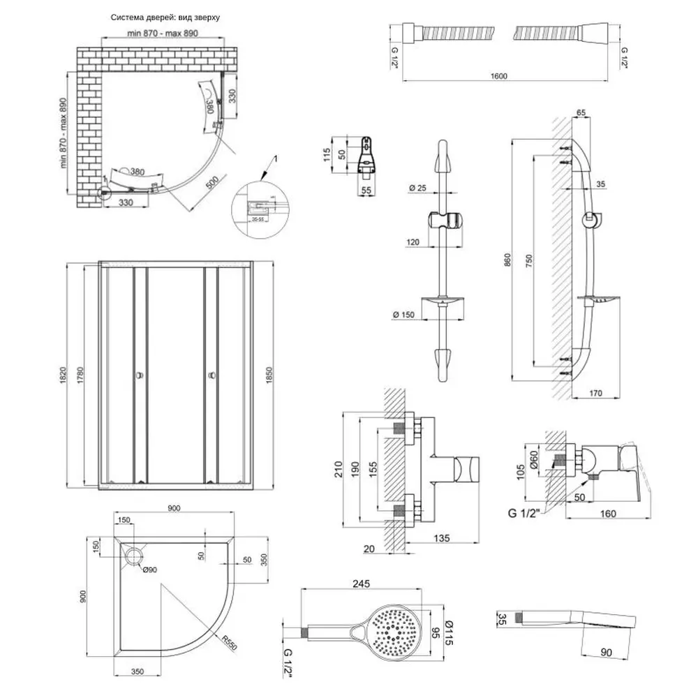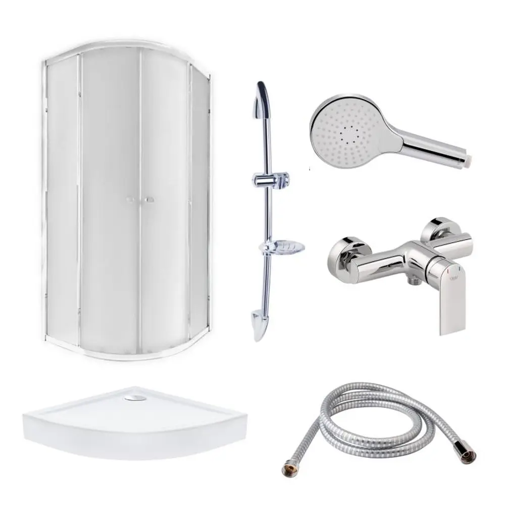 Подвійні ролики, ручки, верхній профіль, нижній профіль, бічні профілі, набір ущільнювачів, розширювальні профілі, 2 скляні двері, 2 глухі скла, комплект кріплень, заглушки, елементи, що з‘єднують, фіксатори. Піддон, ніжки, сифон із гідрозатвором. Змішувач, захист гайок від подряпин, кріплення. Штанга для душу, кронштейн для ручного душу, мильниця, кріплення. Душовий шланг. Лійка для ручного душу, зворотний клапан.