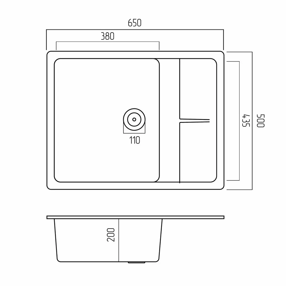 Завдяки своїм компактним розмірам - довжина 650 мм і ширина 500 мм,глибина 200мм- ця мийка ідеально підходить для невеликих кухонь, де кожен дюйм простору цінний. Квадратна форма додає сучасності та гармонію у дизайні.Розмір чаші 380х435х200мм.