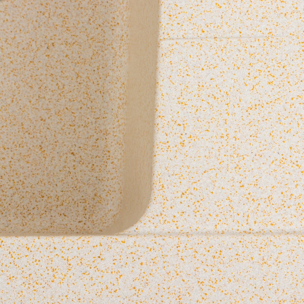 Ця мийка виготовлена за допомогою технології Solid Surface, що гарантує її якість і довговічність. Цей матеріал виготовляється методом лиття, і в ньому поєднуються 80% кварцевого піску та 20% смоли. Візуально він нагадує природний камінь, а його поверхня є теплою і шовковистою на дотик.