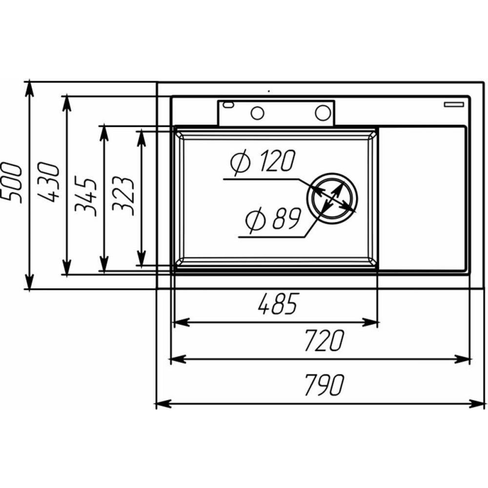 Мийка має одну простору чашу глибиною 200 мм, яка зручно підходить для миття великого посуду чи приготування їжі. Також є зручна сушарка для посуду або овочів. Загальний розмір мийки — 790×500 мм, що робить її універсальною для більшості кухонних стільниць.